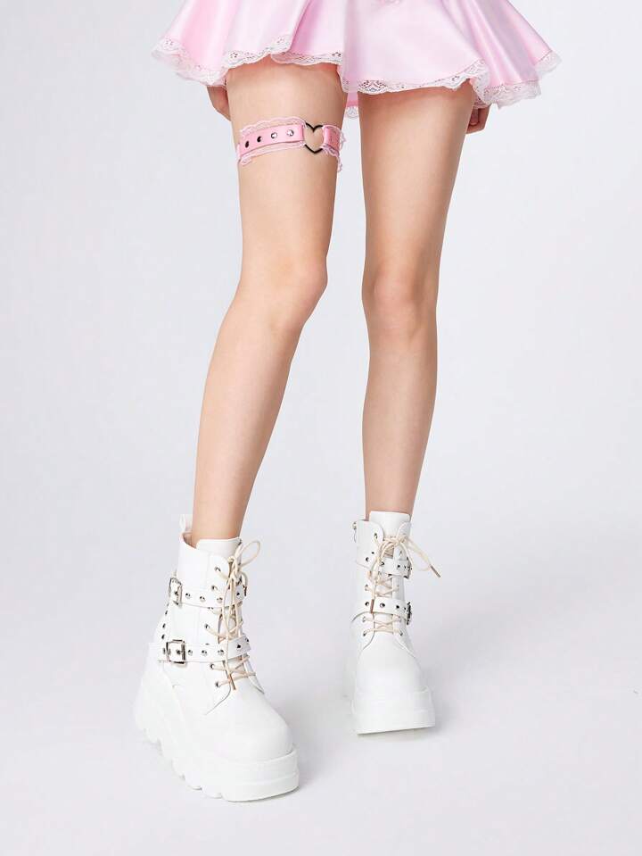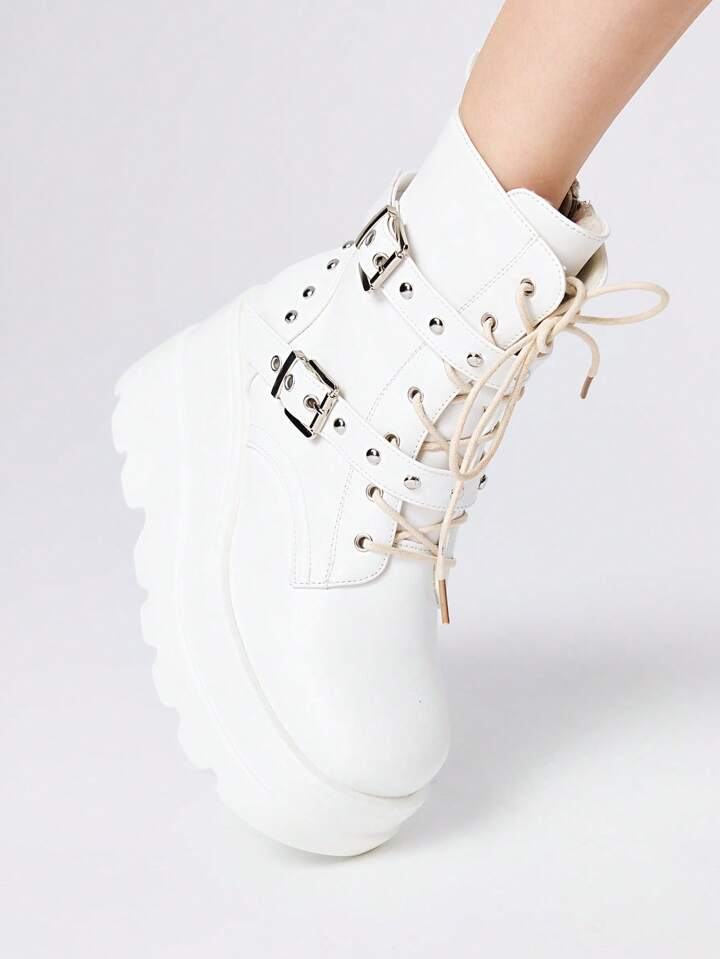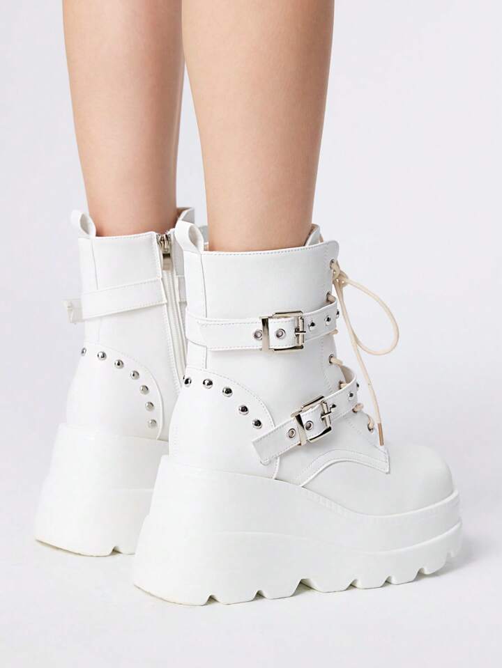 Goth بوت كاحل نسائية بنمط جوثيك بانك سميكة الكعب مدببة الأصابع مع حلقات وبراشيم، باللون الأسود، مناسبة لعيد الهالوين