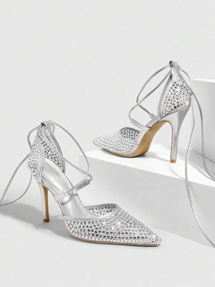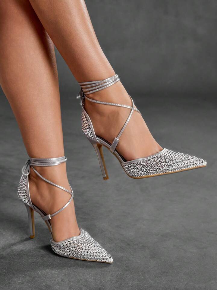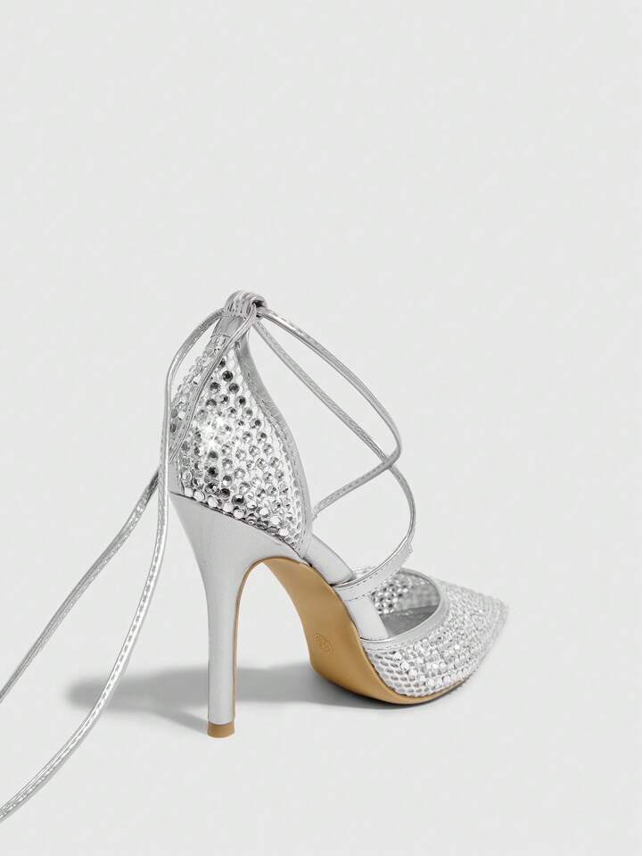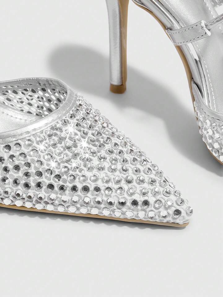 نساء كعوب عالية إصبع القدم المدبب ذات الفضي صنادل ، إبرة كعب عالي شبكي مفرغ حذاء سهرات نادي مثير أحذية كعب مشبك