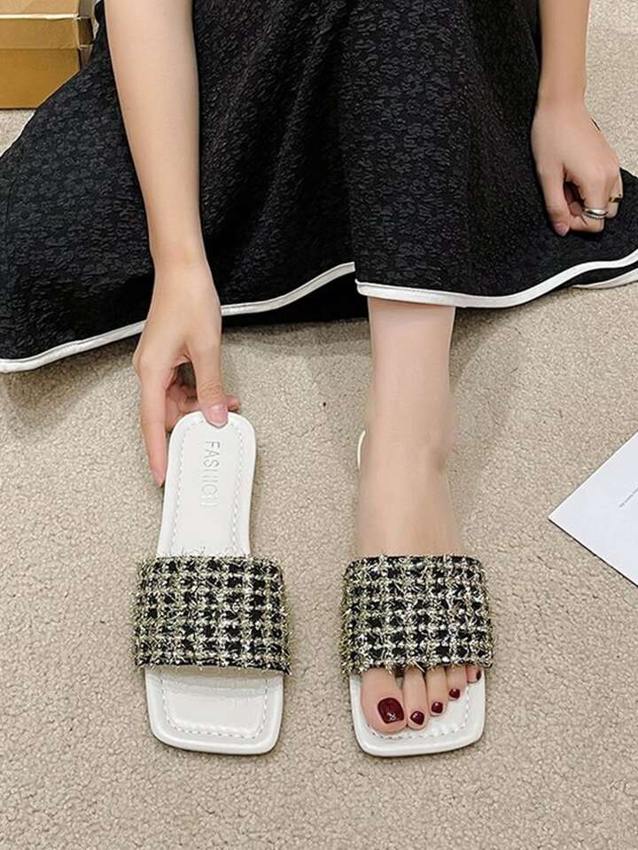 صنادل سلايد مقلم بخام نمط مربع النقش مسطح نيلون الموضة الى خارجي نساء