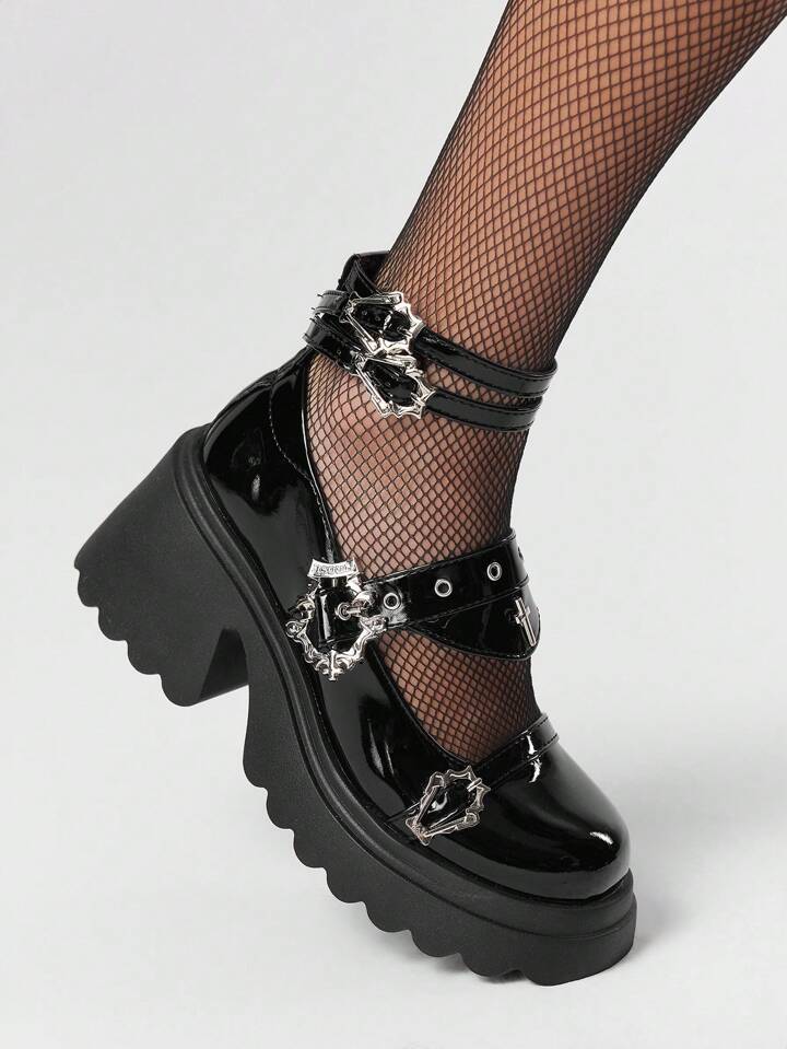 Goth حذاء نسائي بكعب سميك، إبزيم وحذاء ماري جين مغلق من الأمام، من الجلد بطراز صخري، بانك، جوث