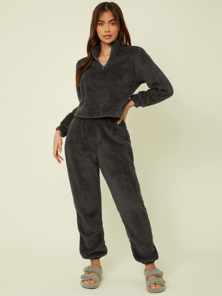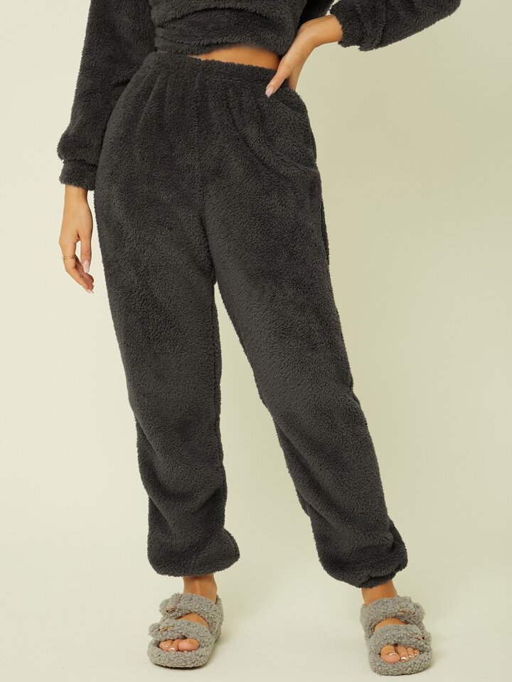 بنطلون نسائي من الفلانيل الرمادي الداكن مع جيوب، بنطلون طويل مريح وعصري، قماش مطاطي عالي المطاطية، فضفاض ودافئ للشتاء