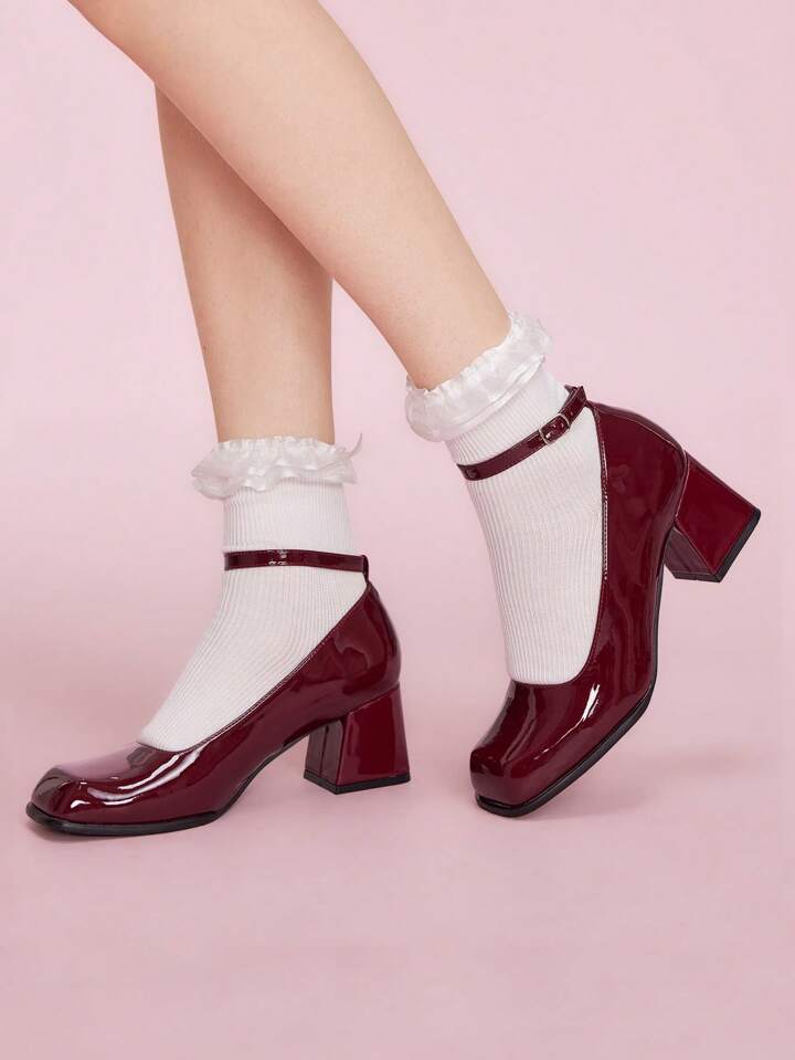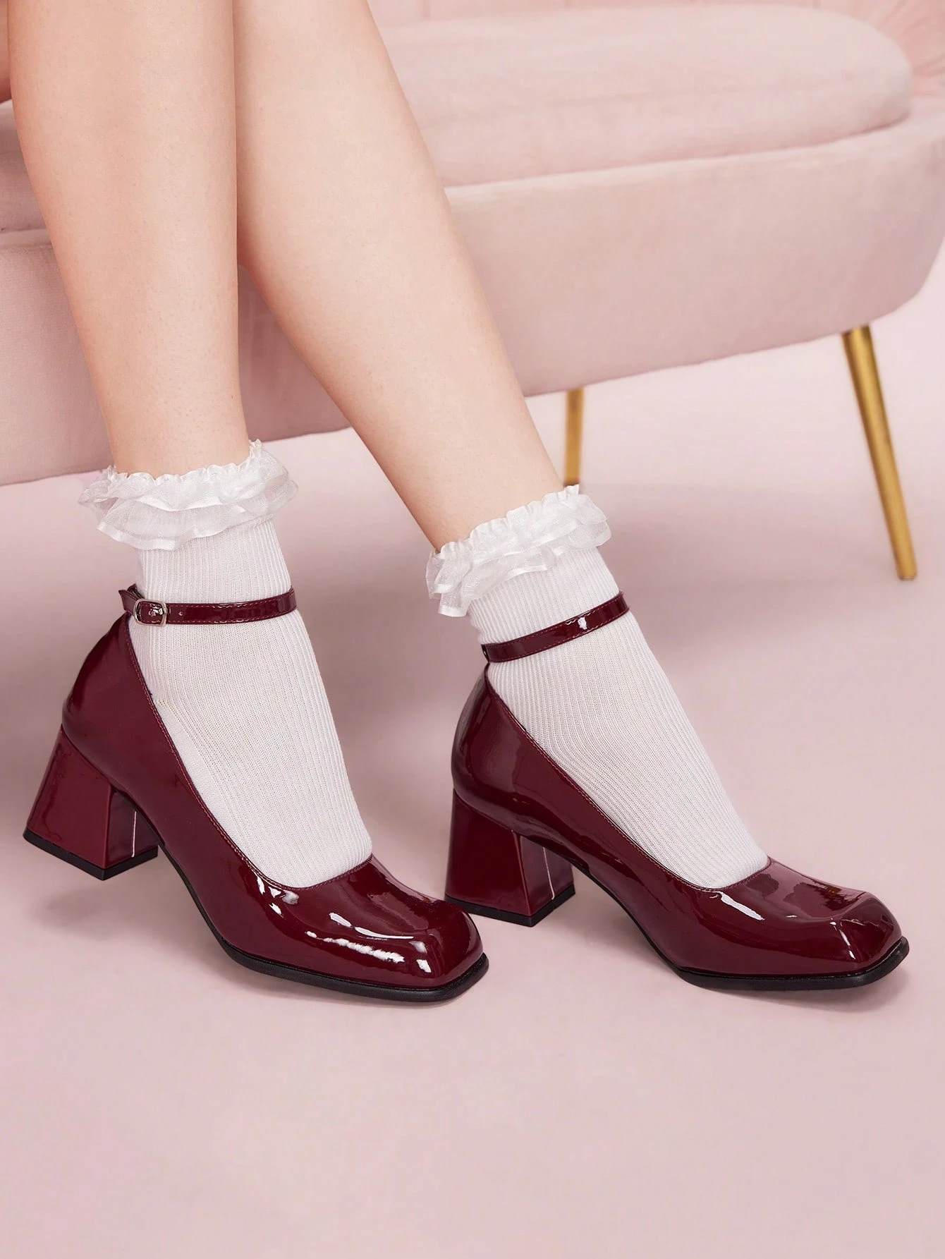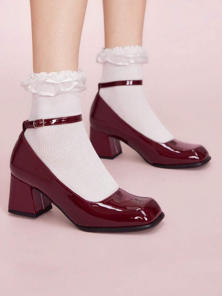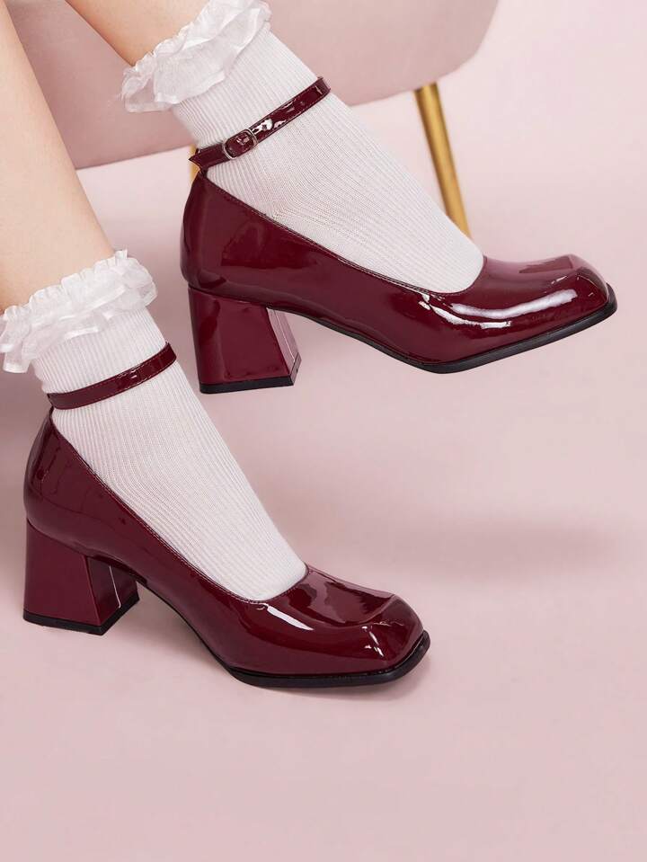 نساء موضة كعب سميك لامع مربع الرأس، كعب عالي معشق