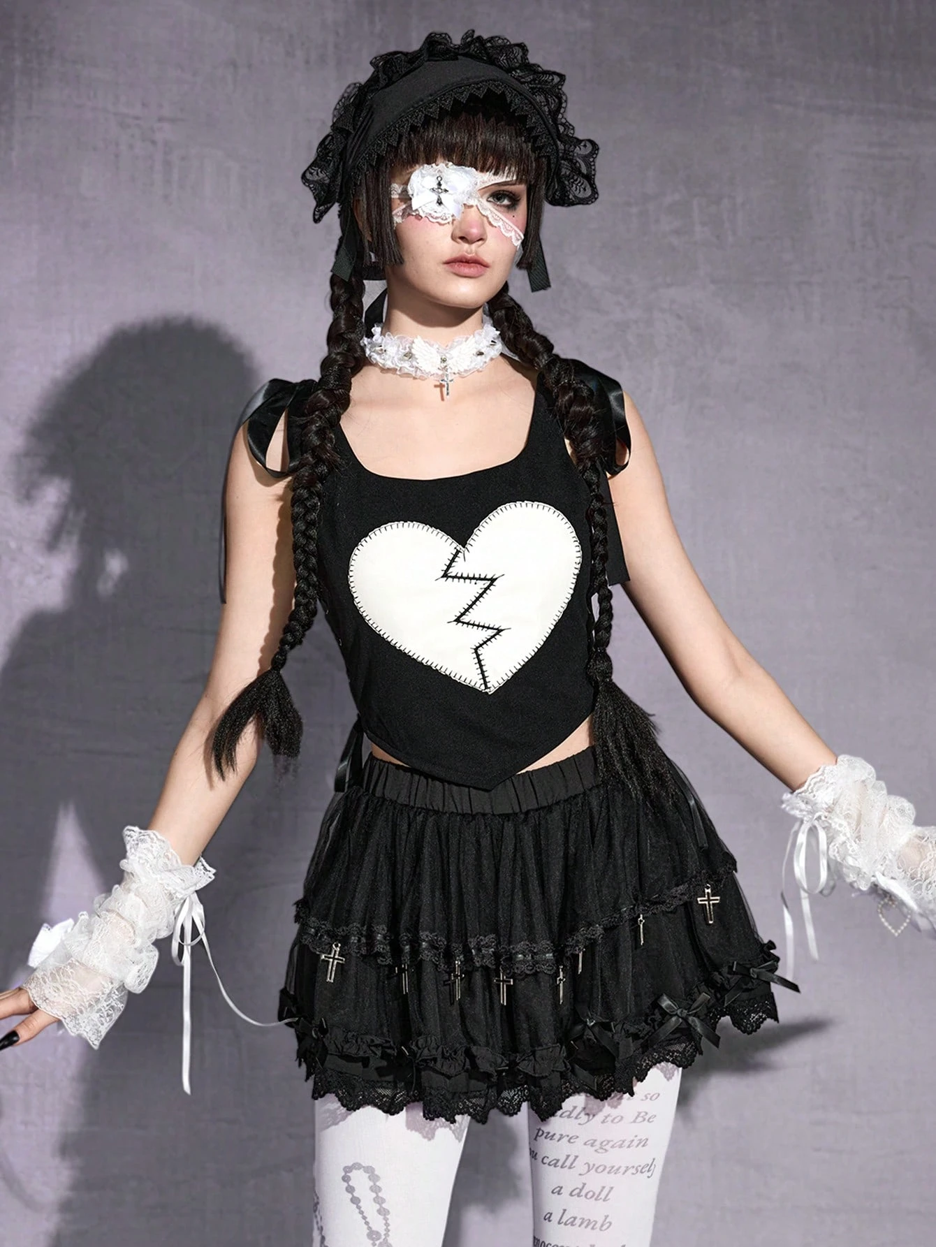 Goth قميص كروب نسائي ضيق الكتف مطرز بشكل قلب وفيونكة بطراز جوثيك