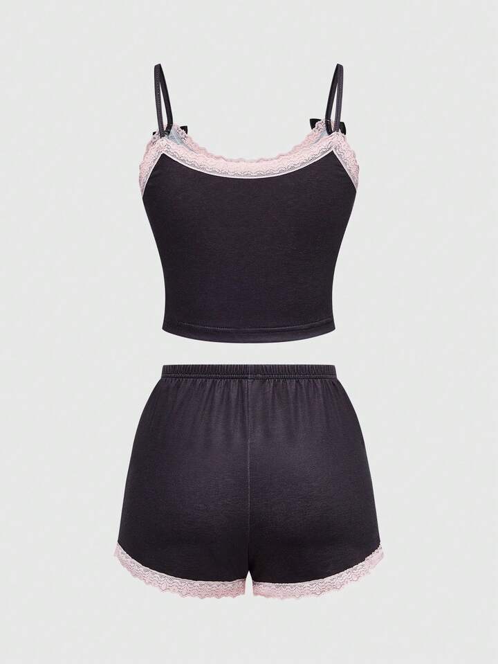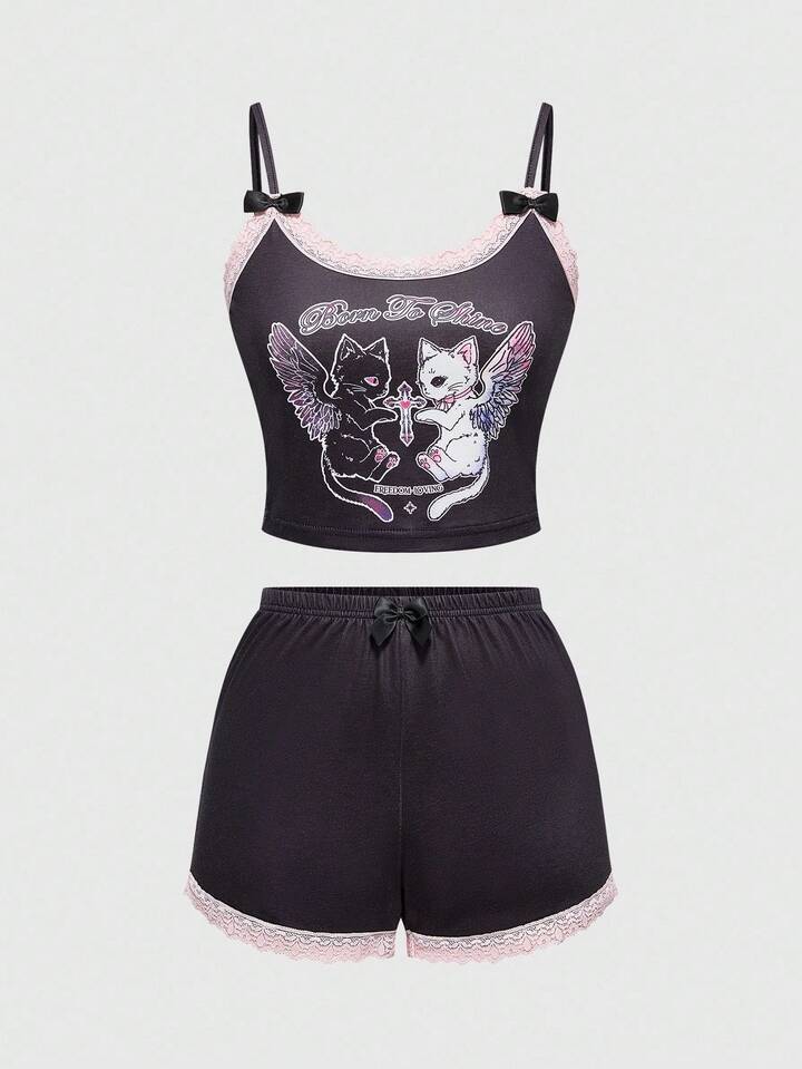 مجموعة بيجاما للنساء تتكون من قميص كامي بتصميم صليب وفراشة سوداء وبيضاء بطراز الملائكة والقطط Y2K، وشورت مطرز بقطة سوداء