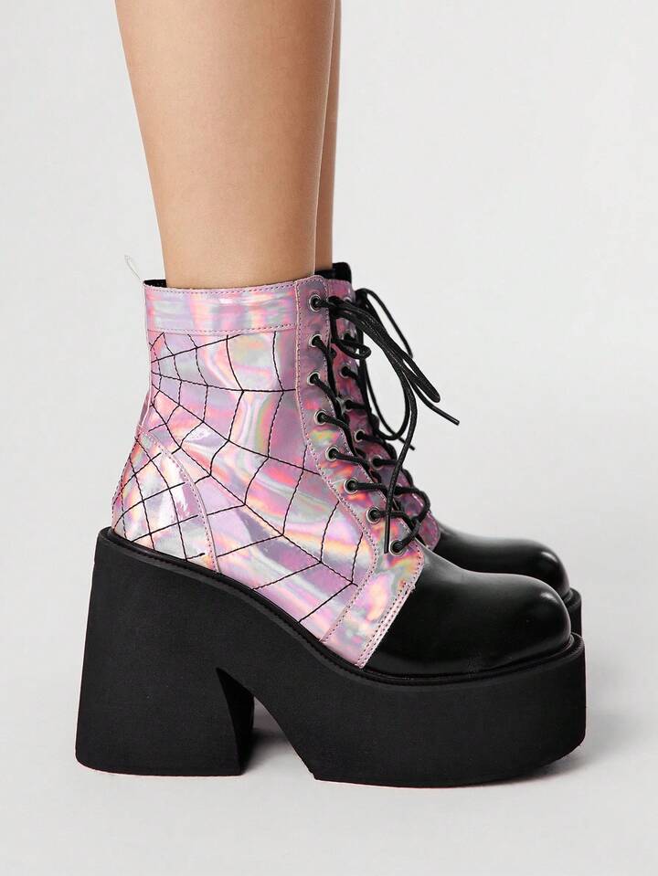بوت كاحل نسائية ذات كعب عالي بطراز بانك عصري بنمط شبكة العنكبوت وسُمك في الأربطة