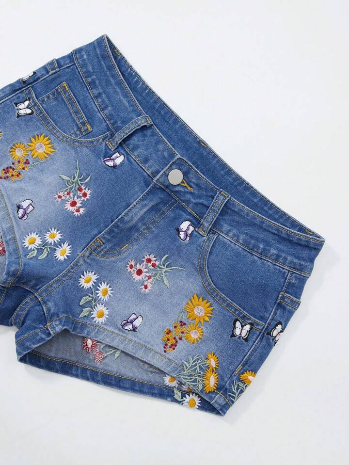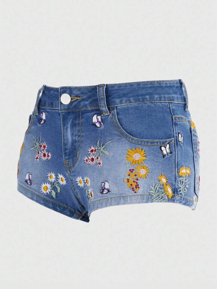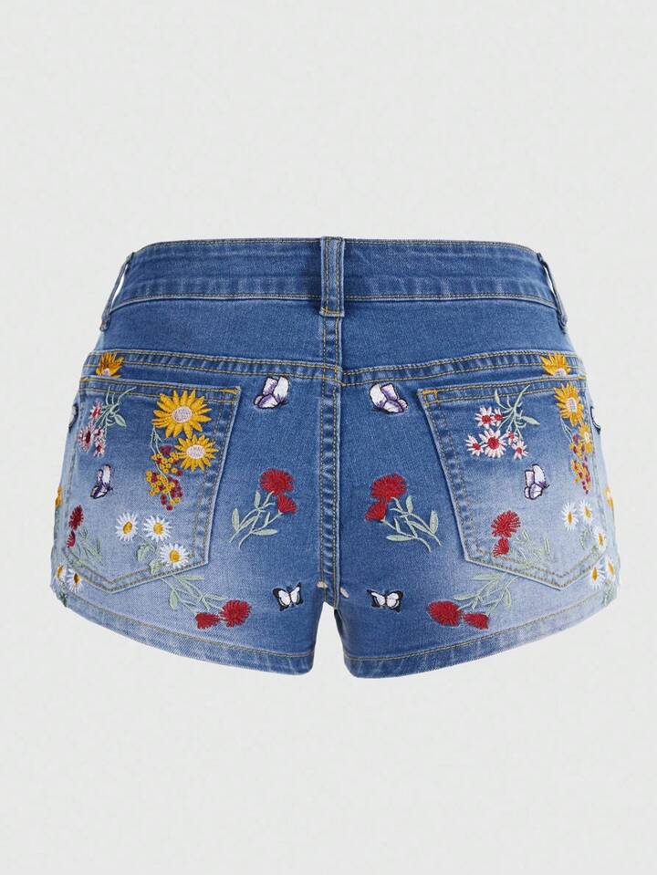 شورتات جينز مطرزة بزهور الاقحوان بخصر منخفض جدًا للنساء