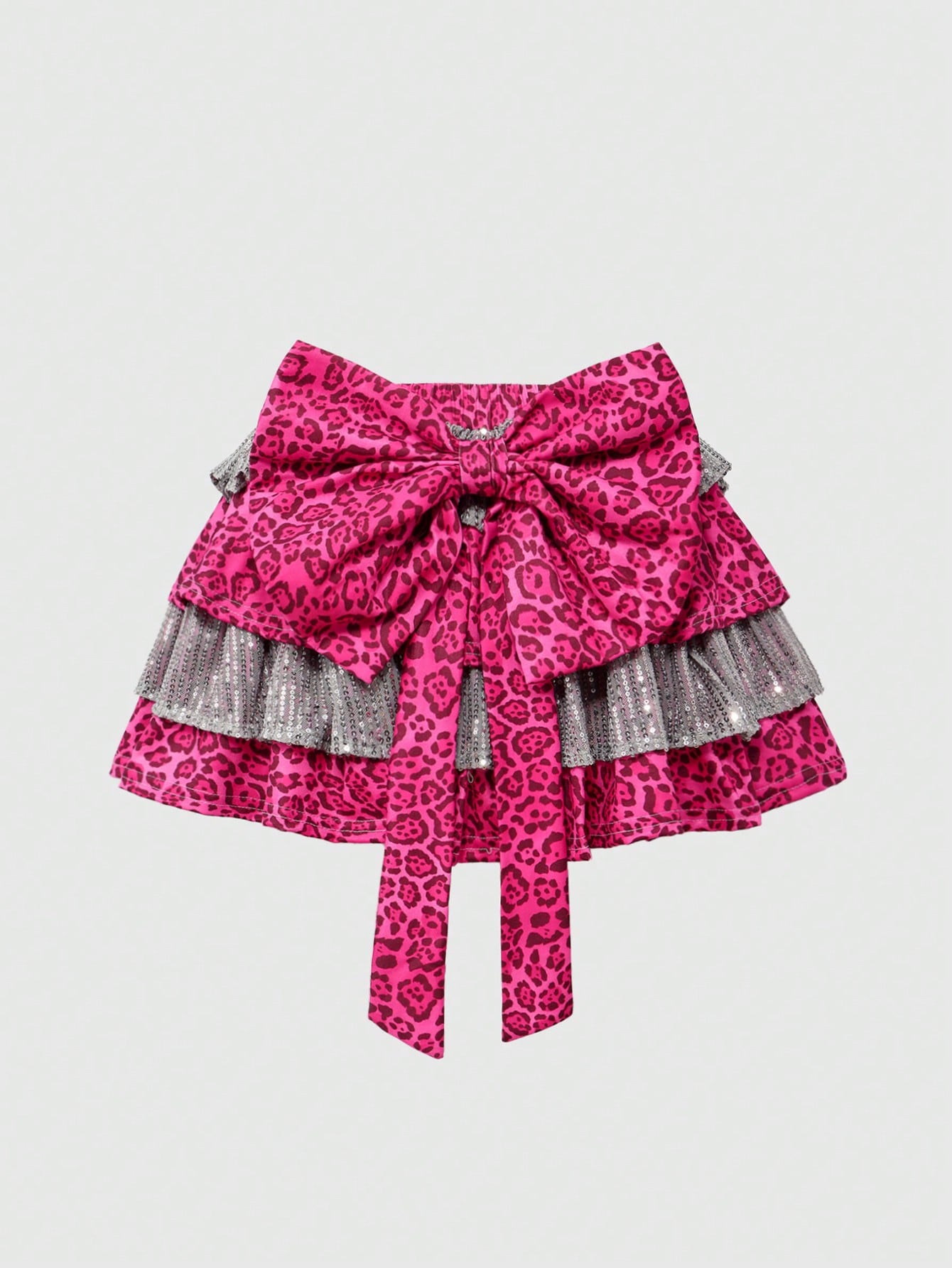 تنورة قصيرة مصممة بقماش الليوبارد اللامع و تفاصيل كشكشة و فيونكة للنساء
