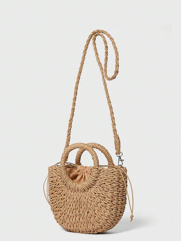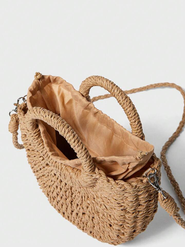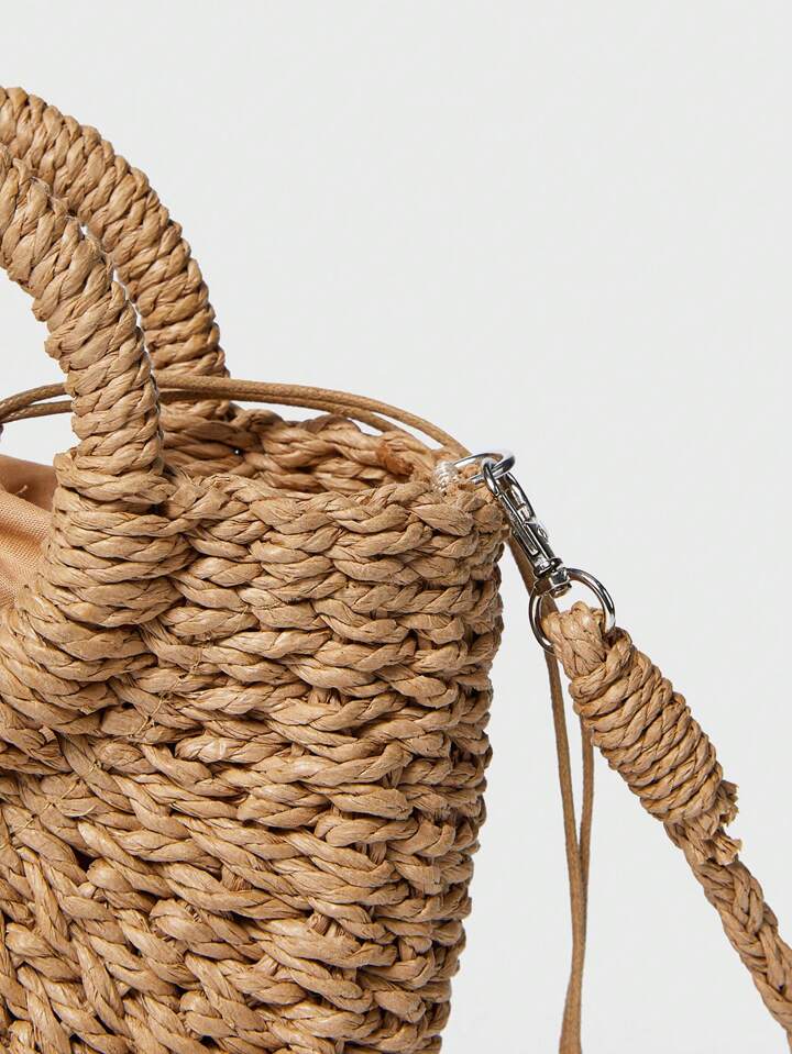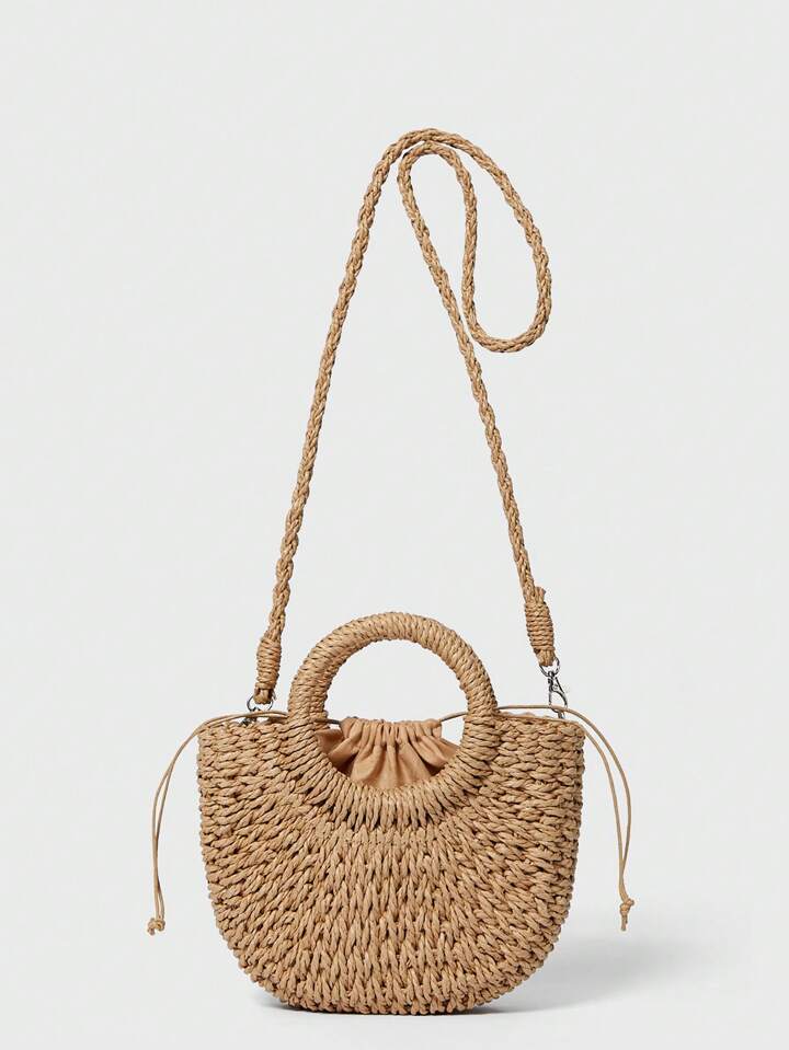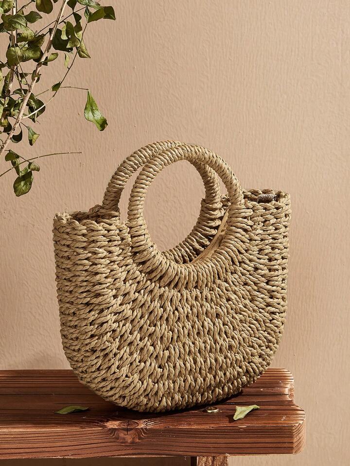 حقيبة سااتشل منسوجة مع مقبض حلقة، حقيبة قش عصرية
