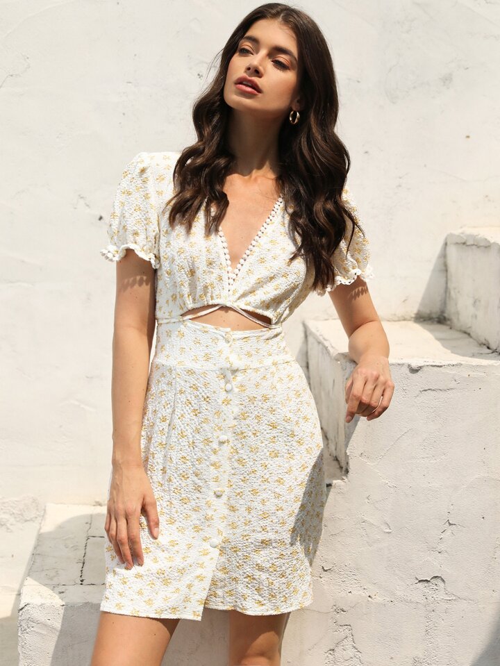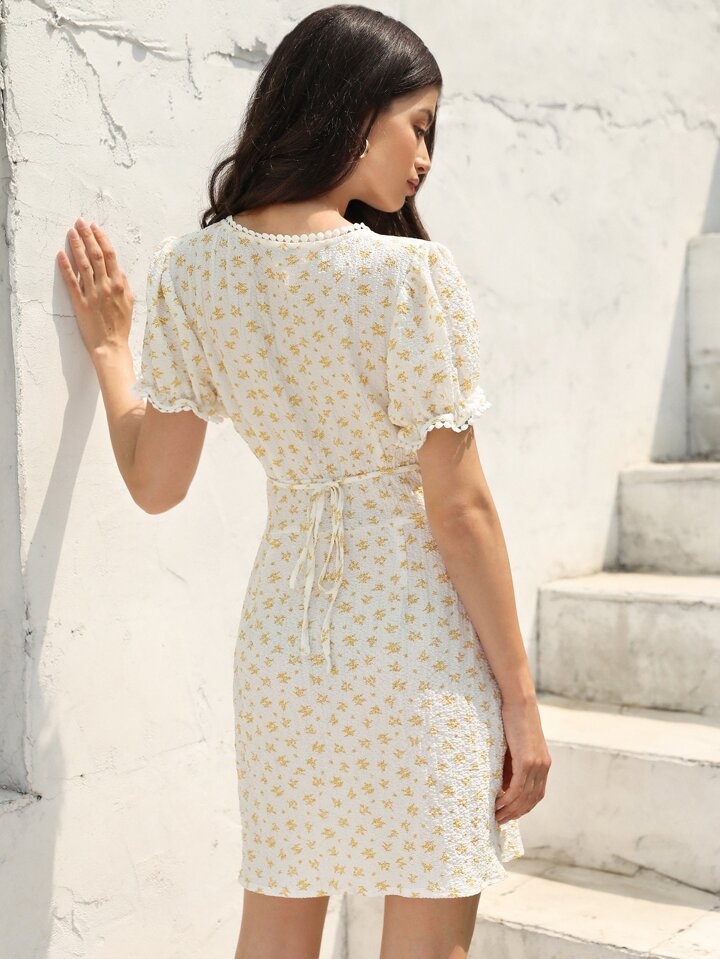 فستان مزهر اقحوان بتفاصيل كرات مخمل ومطوي بربطة خلفي