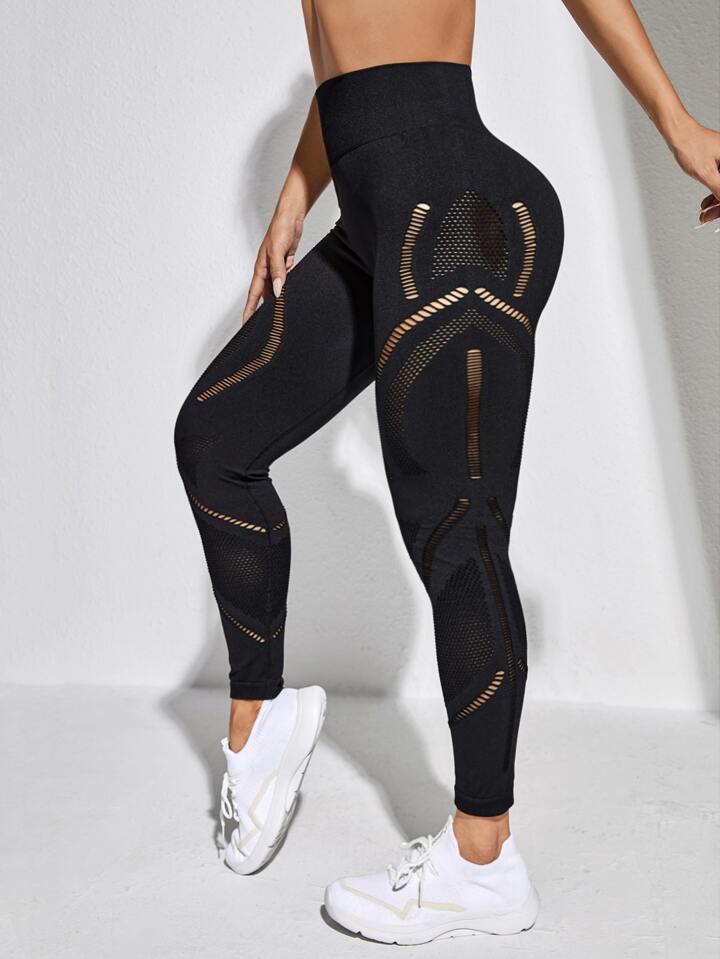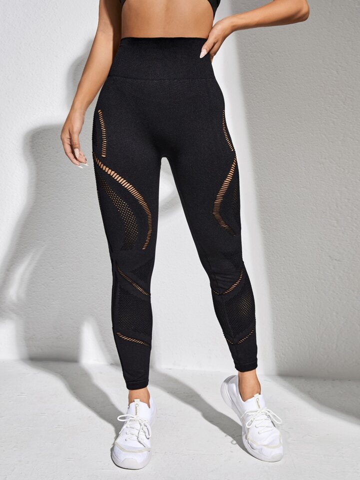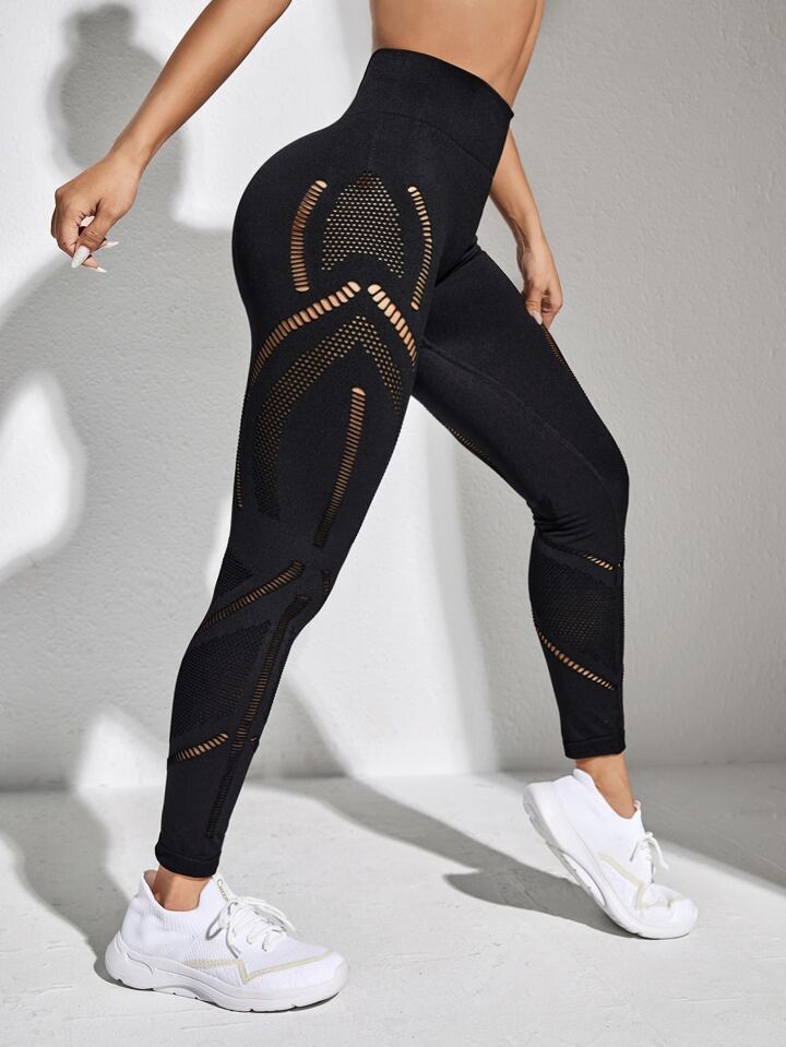 بنطلون يوجا ليجنز رياضي بدون خياطة بفتحات مفرغة للتحكم في البطن مع حزام عريض