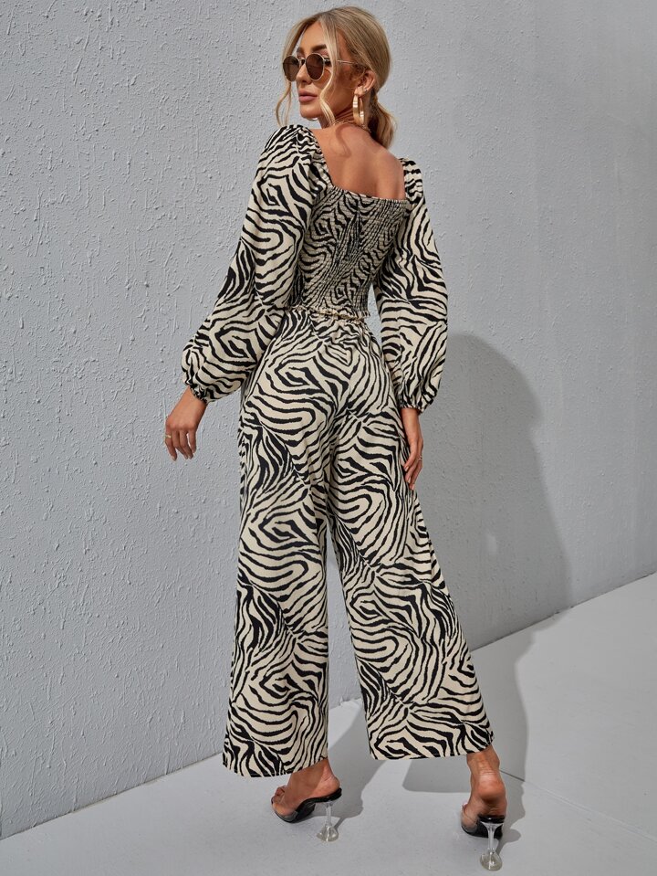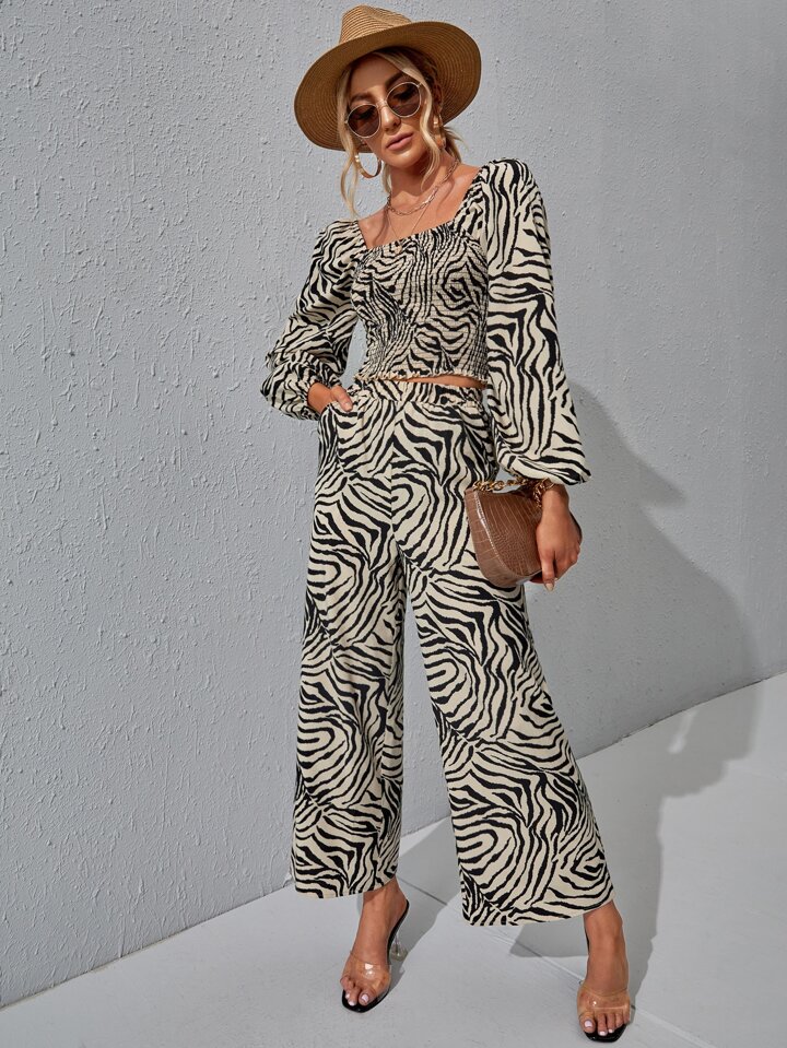 بلوزة مكرنشة ومخططة بجلد الحمار الوحشي وبنطلون