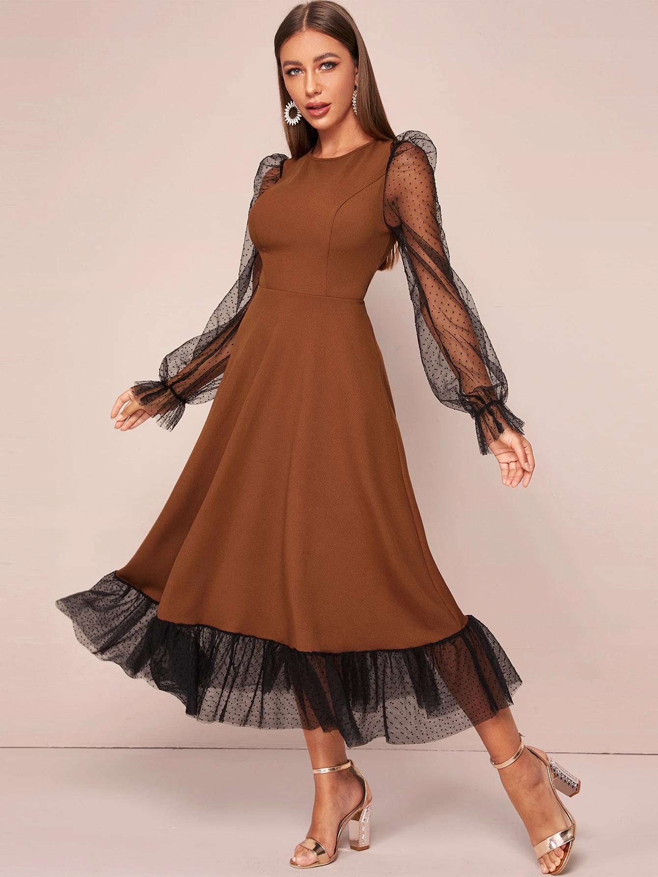 فستان بحافة وبأكمام شبكي منقط بسستة