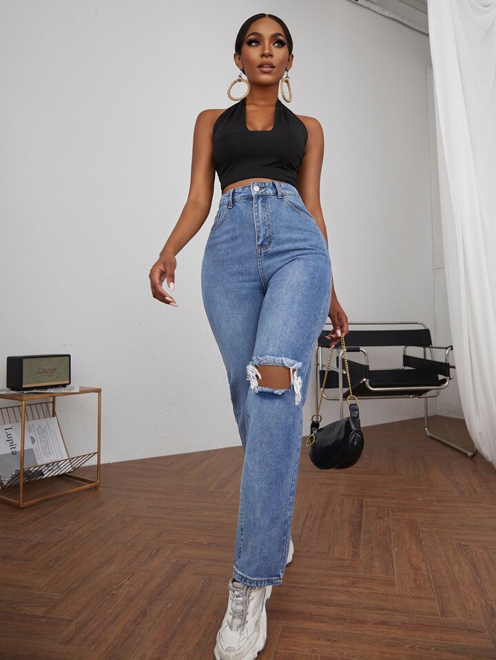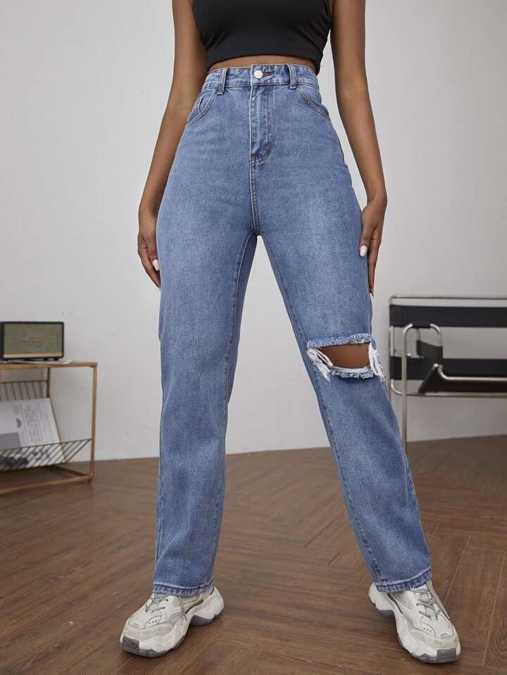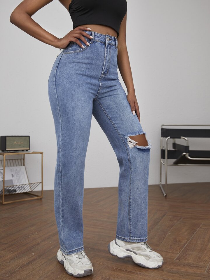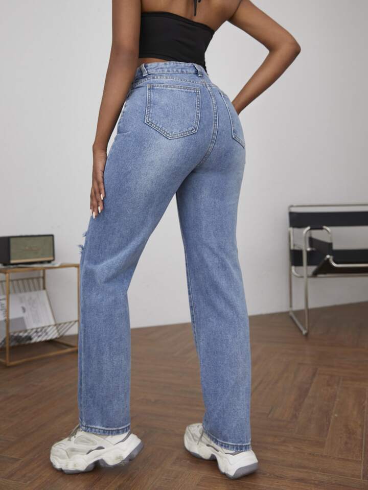 بنطلون جينز بتفاصيل ممزق وبسستة