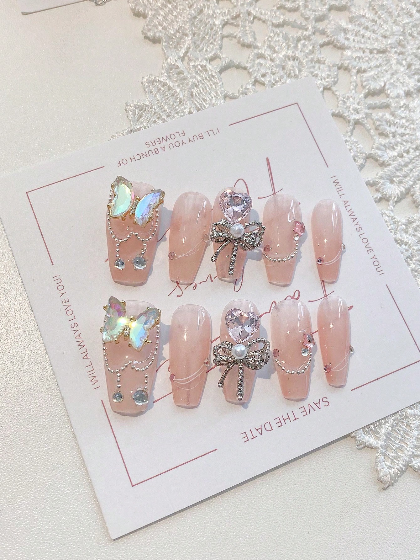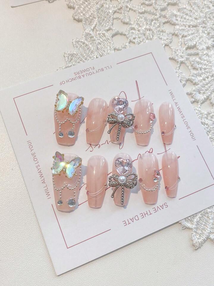 10 أظافر اصطناعية شفافة وشفافة لامعة وطويلة تشتمل على لمعان اللؤلؤ مع مادة لاصقة الجيلي المرفقة