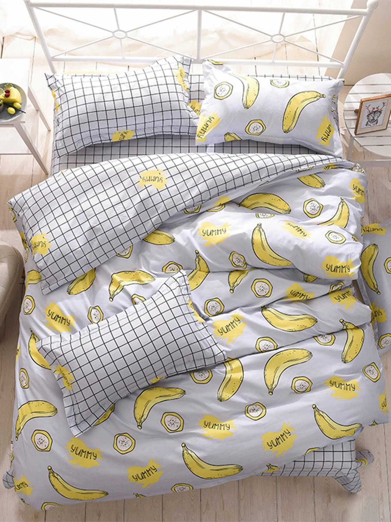 1.5m 4Pcs Banana Print Grid Bed Sheet Set