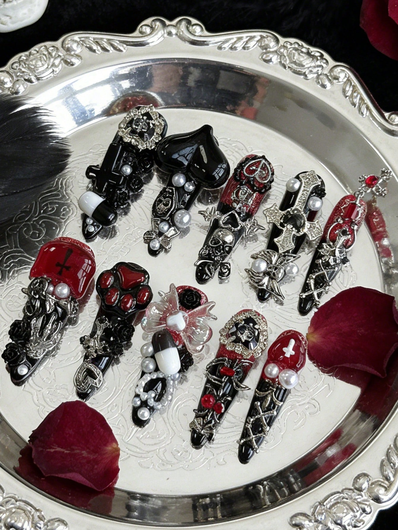 10pcs Dark Punk Style Halloween Handmade Press-On Nails + 3 Sheets Double-Sided Adhesive, Y2K Gothic Manicure Set, Removable, Rhinestone Decorated With Faux Pearl Chain, Suitable For Festivals, Parties, Dancing And Daily Wear