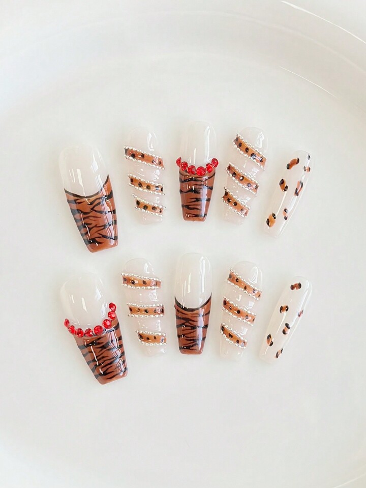 10pcs High Quality Punk Style Leopard Print Handmade False Nails + 3 Sheets Double-Sided Adhesive, Y2K Gothic Chain Leopard Nail Arts, Removable & Reusable, Suitable For Festivals, Parties, Dancing & Daily Wear, Halloween
