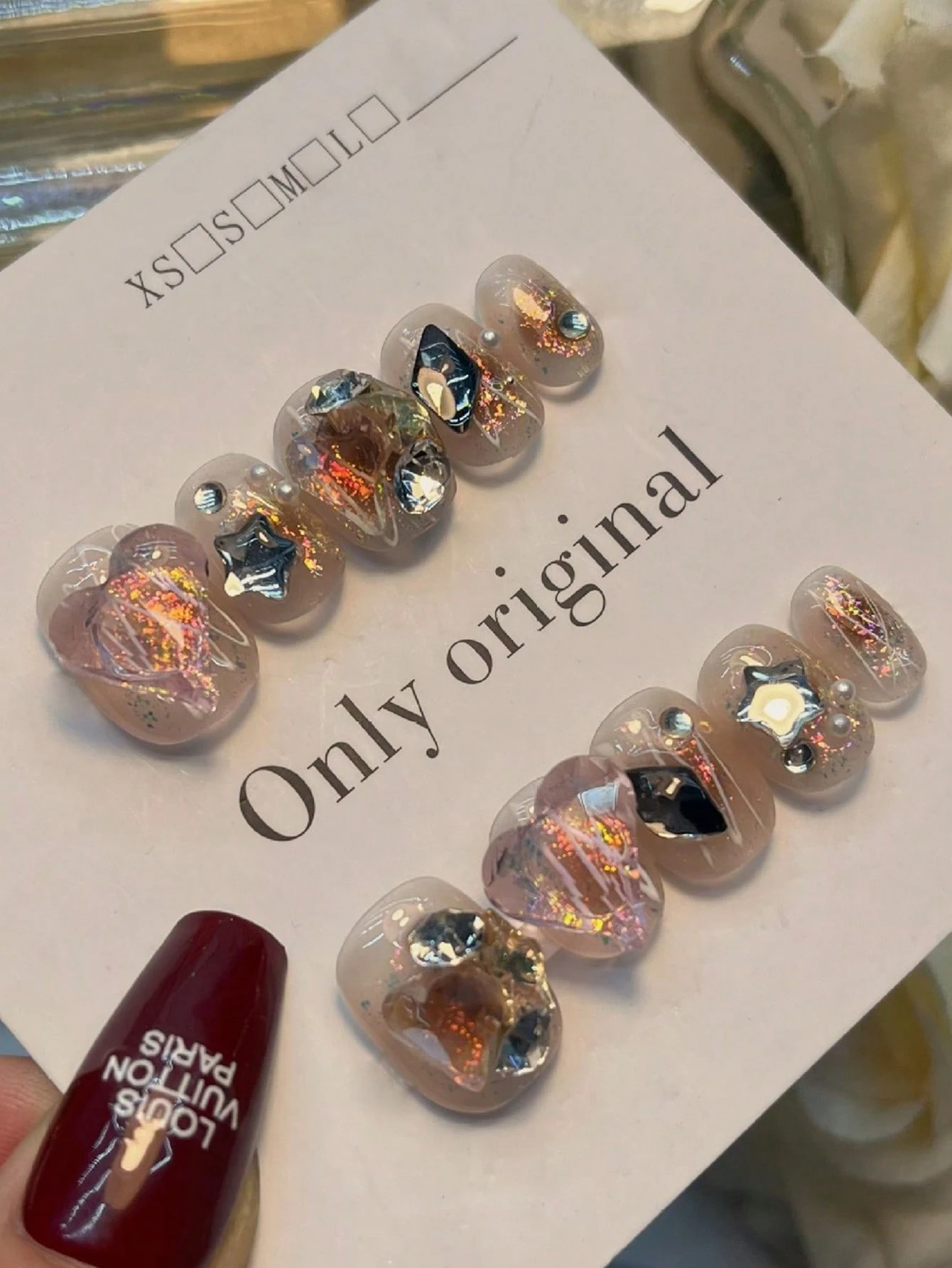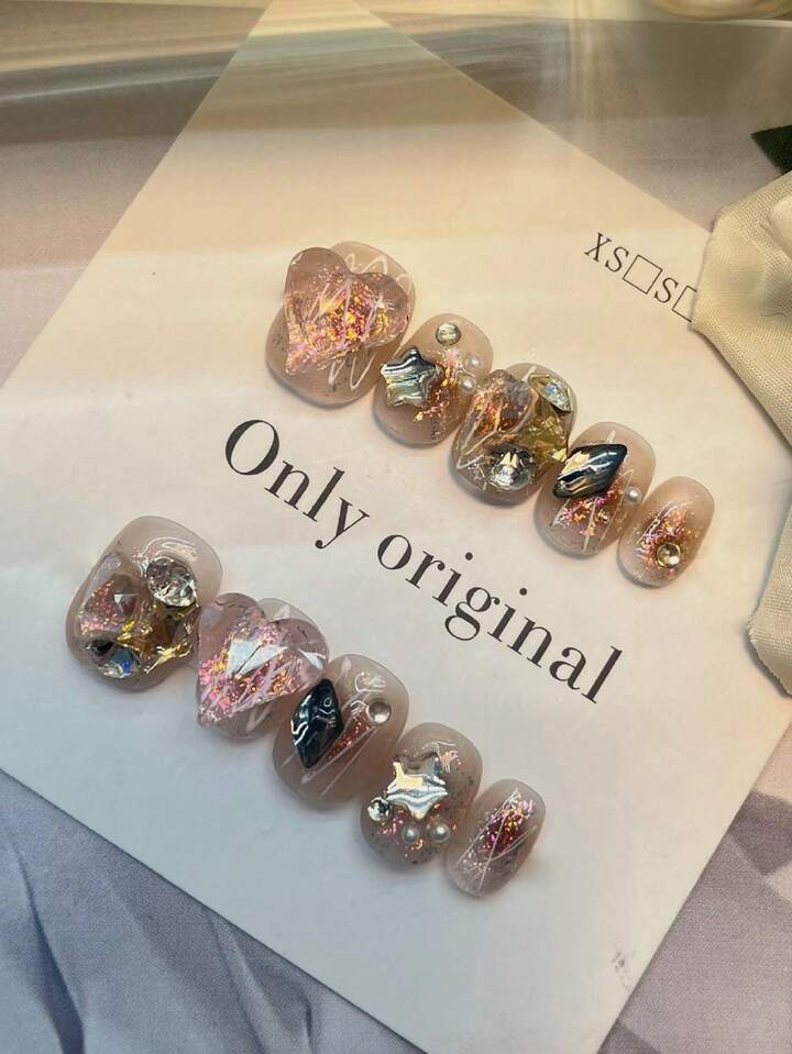 10pcs Short False Nails With Little Town & Floral Print For Summer, Comes With Jelly Glue