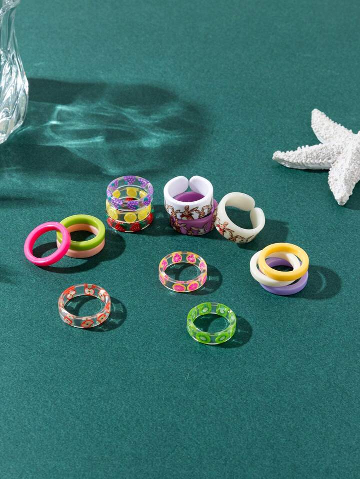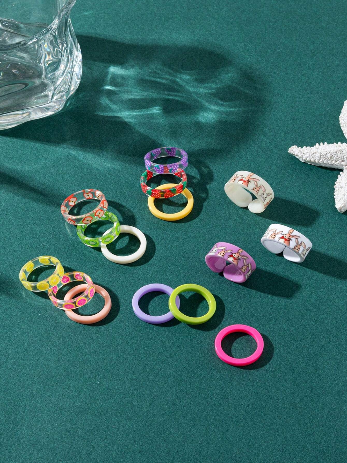 15pcs/set Youthful Creative Colorful Fruit & Cute Rabbit Resin Ring Set