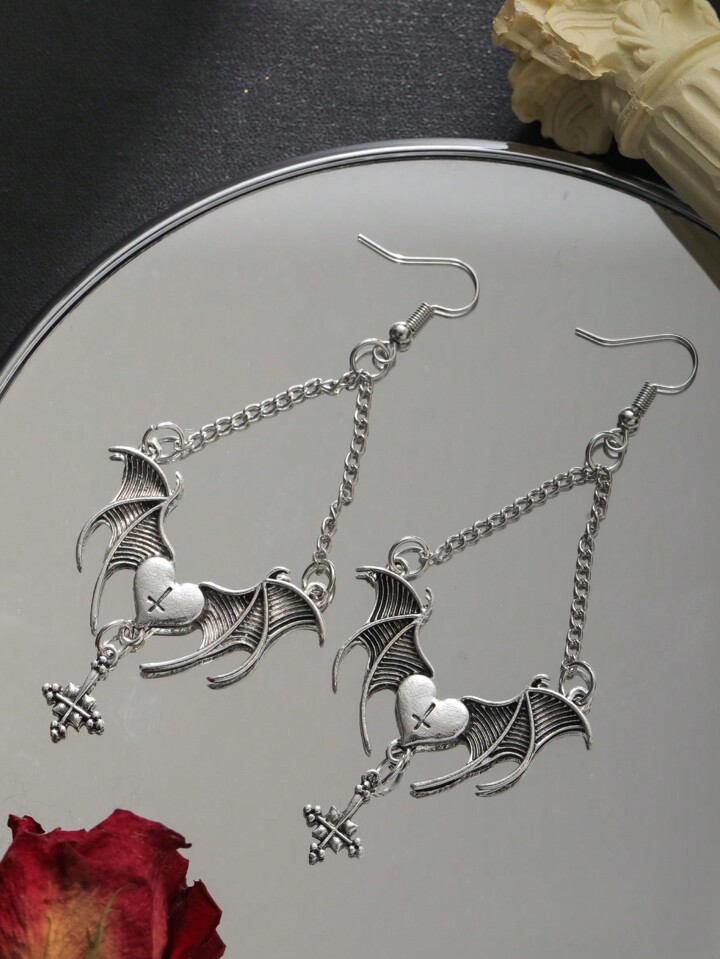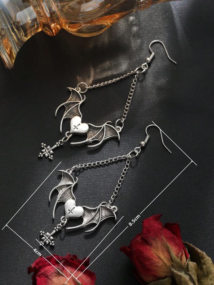 1pair Gothic Dark Chain Bat & Heart Shaped Tassel Dangle Earrings
