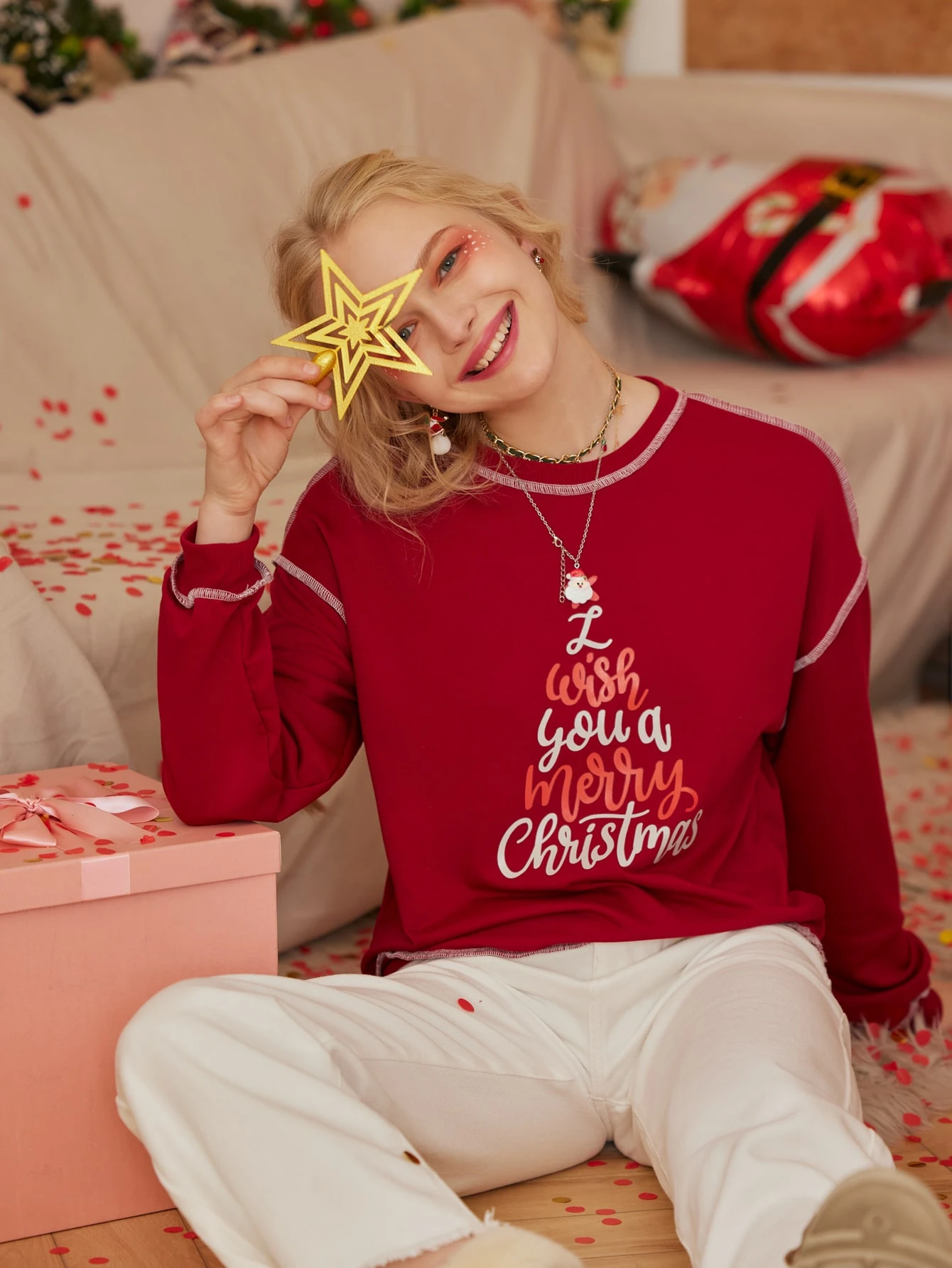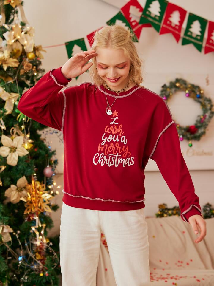 1pc Christmas Letter Graphic Top-stitching Pullover
