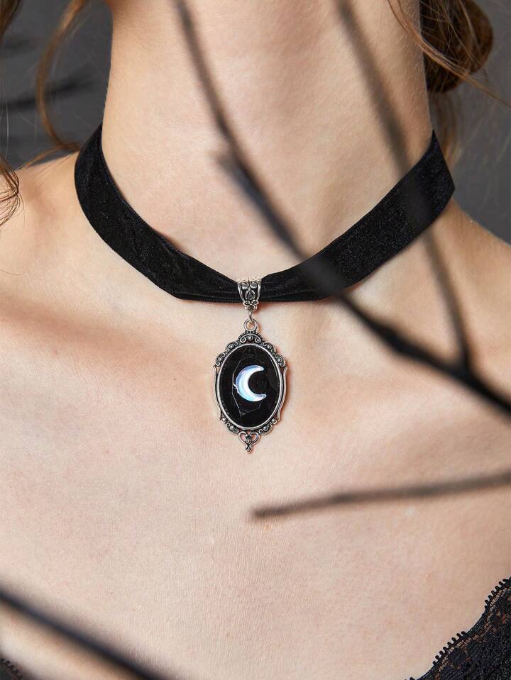 1pc Gothic Black Plush Moon Shaped Pendant Choker