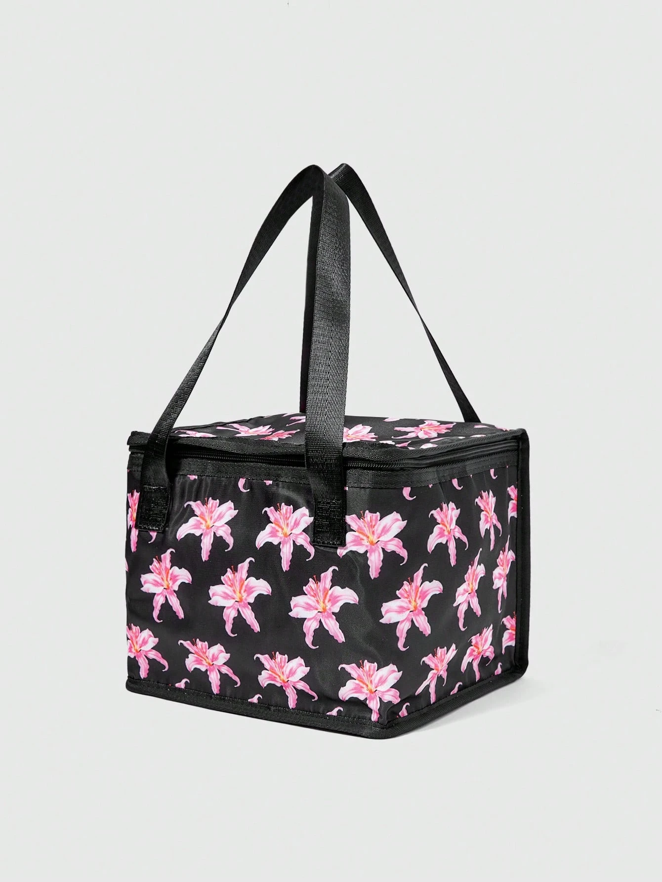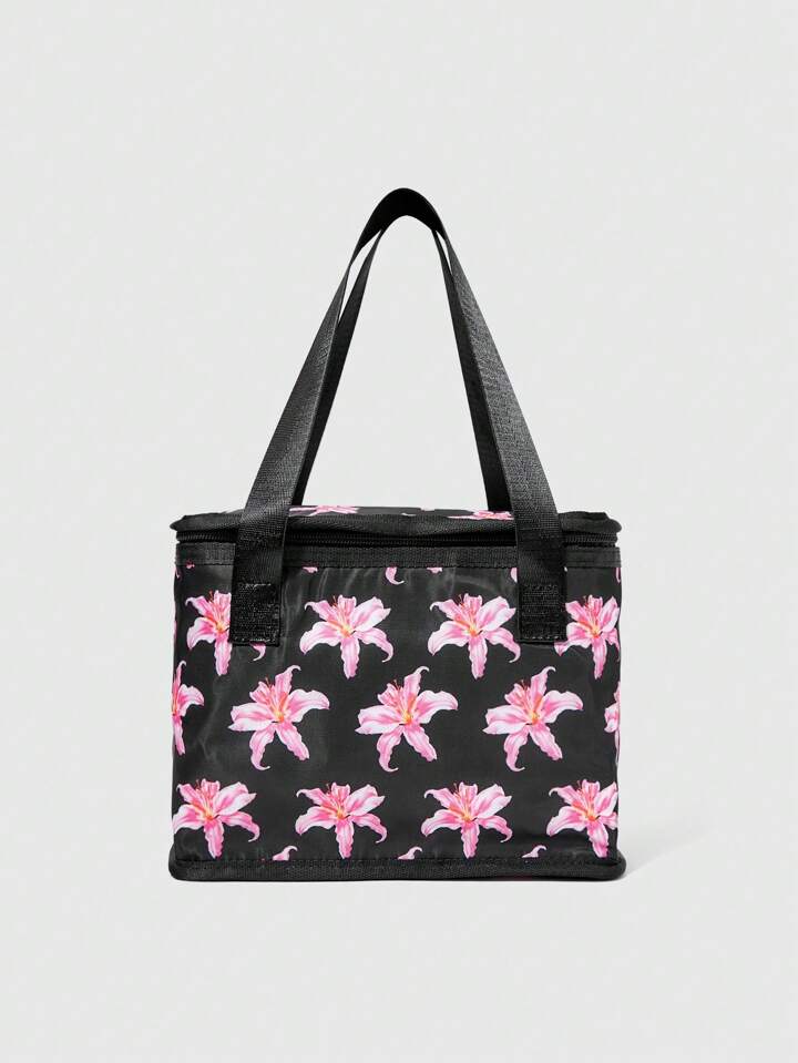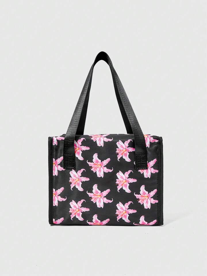 1pc Pink Orchid Flower Print Kawaii Stylish Large Capacity Insulated Waterproof Lunch Bag, Suitable For Back To School Season And Picnics