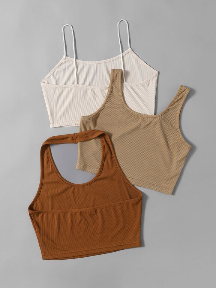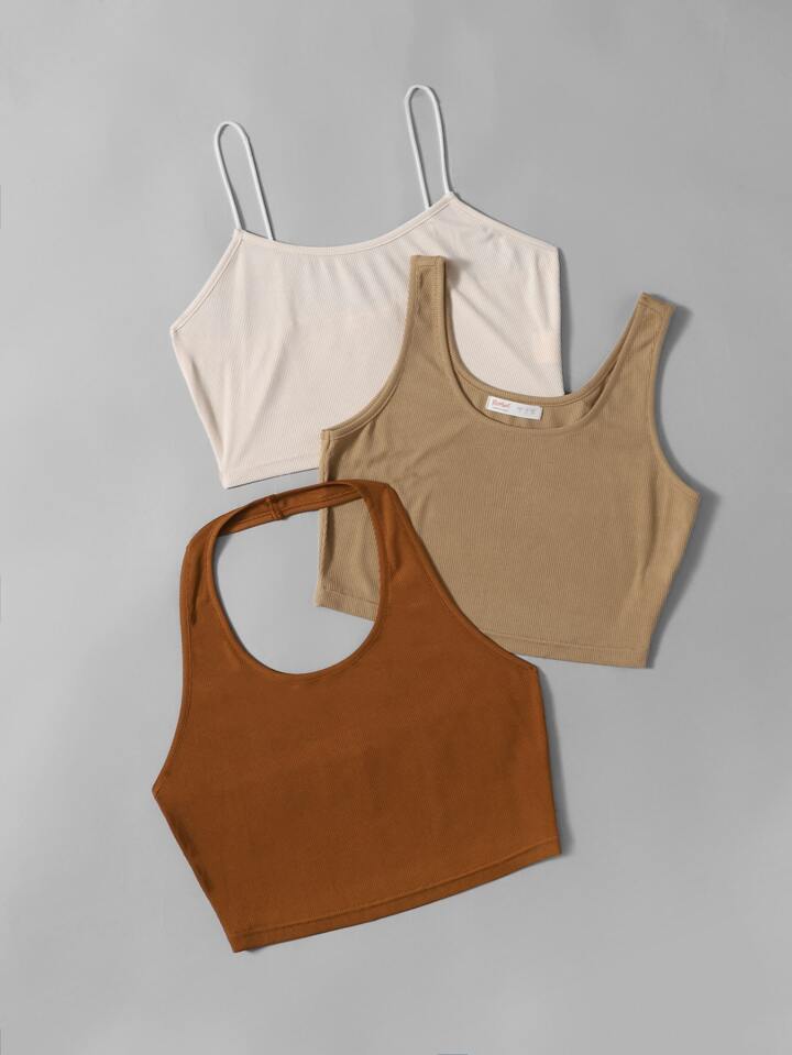 1pc Solid Crop Cami & 1pc Halter Top & 1pc Crop Tank Top
