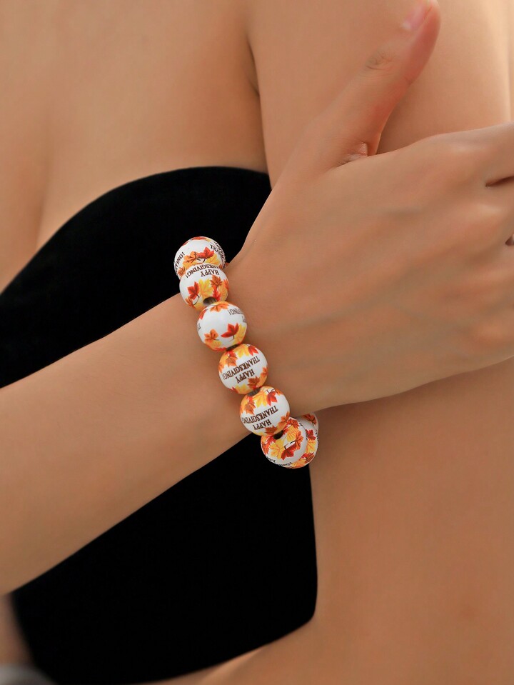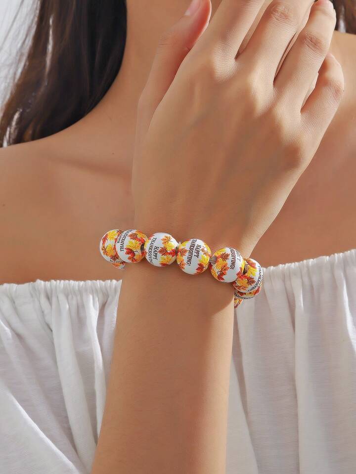 1pc Thanksgiving Fashionable Creative Maple Leaf Printed White Wooden Beaded Elastic Bracelet