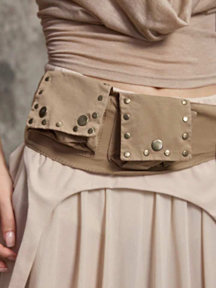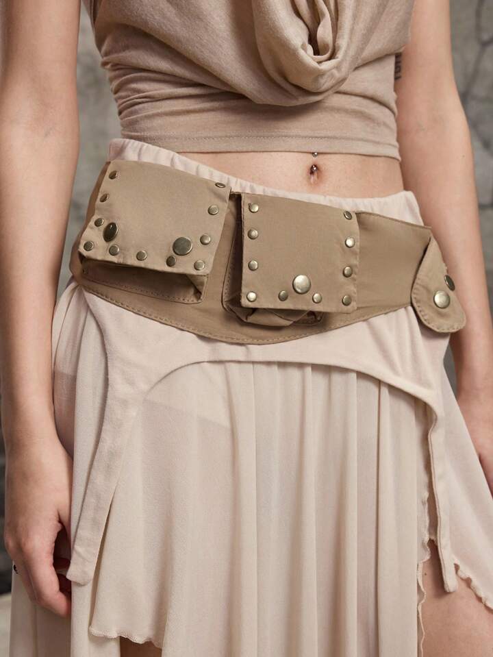 1pc Vintage Hippie Style Multi-Pocket Waist Bag With Rivet Decor Wide Waistband Belt For Women