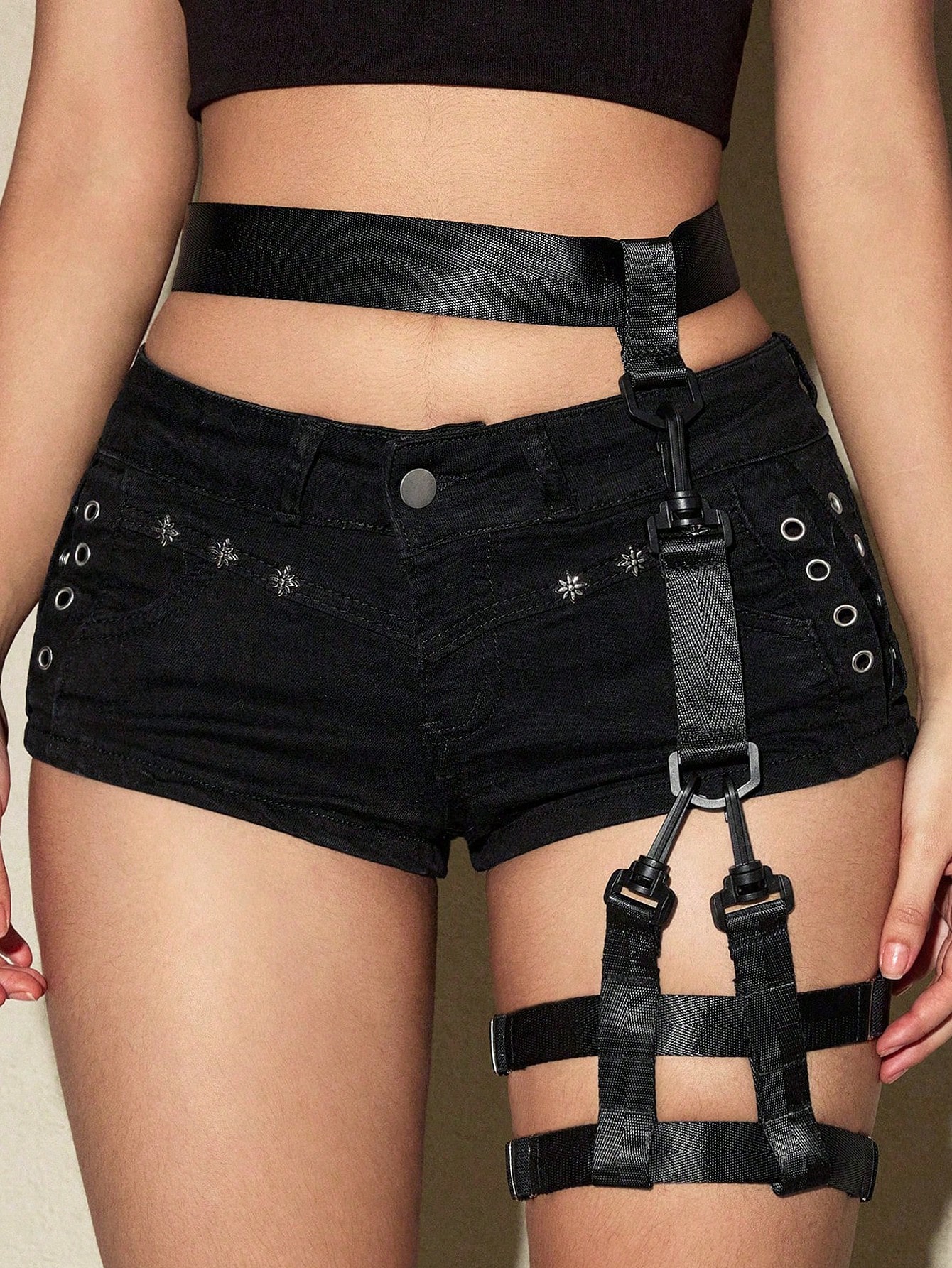 1pc Women's Black Canvas Fabric Single Side Double Layer Elastic Band Leg Decor Dark Goth Style Waist Belt Skirt/Shorts Accessory, Versatile Daily Wear
