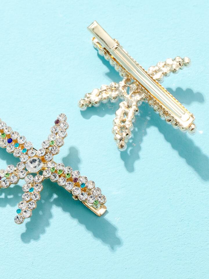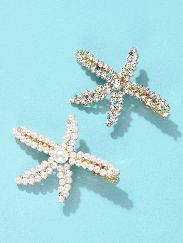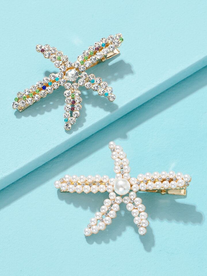 2pcs Faux Pearl Beaded Starfish Design Hair Clip