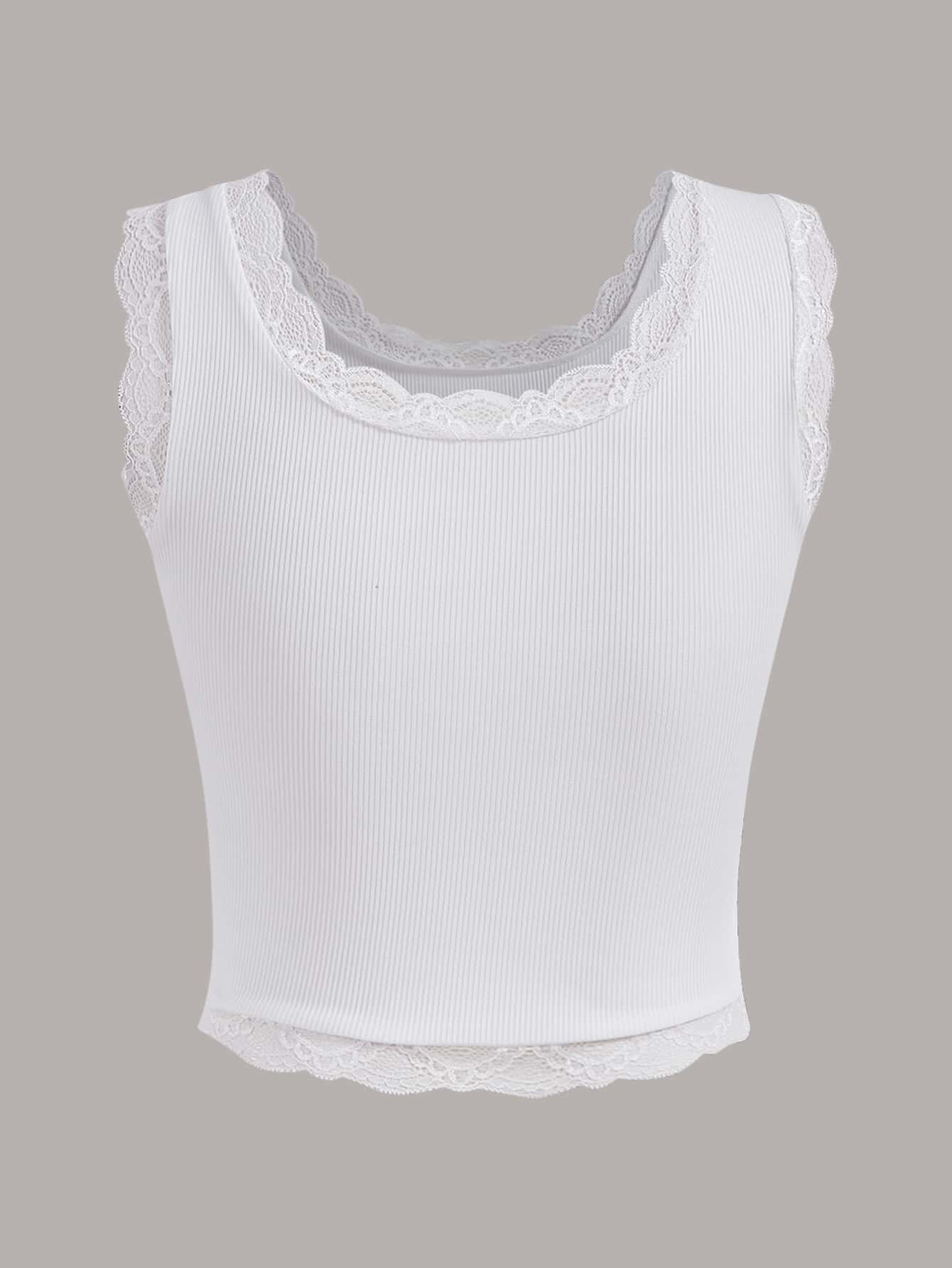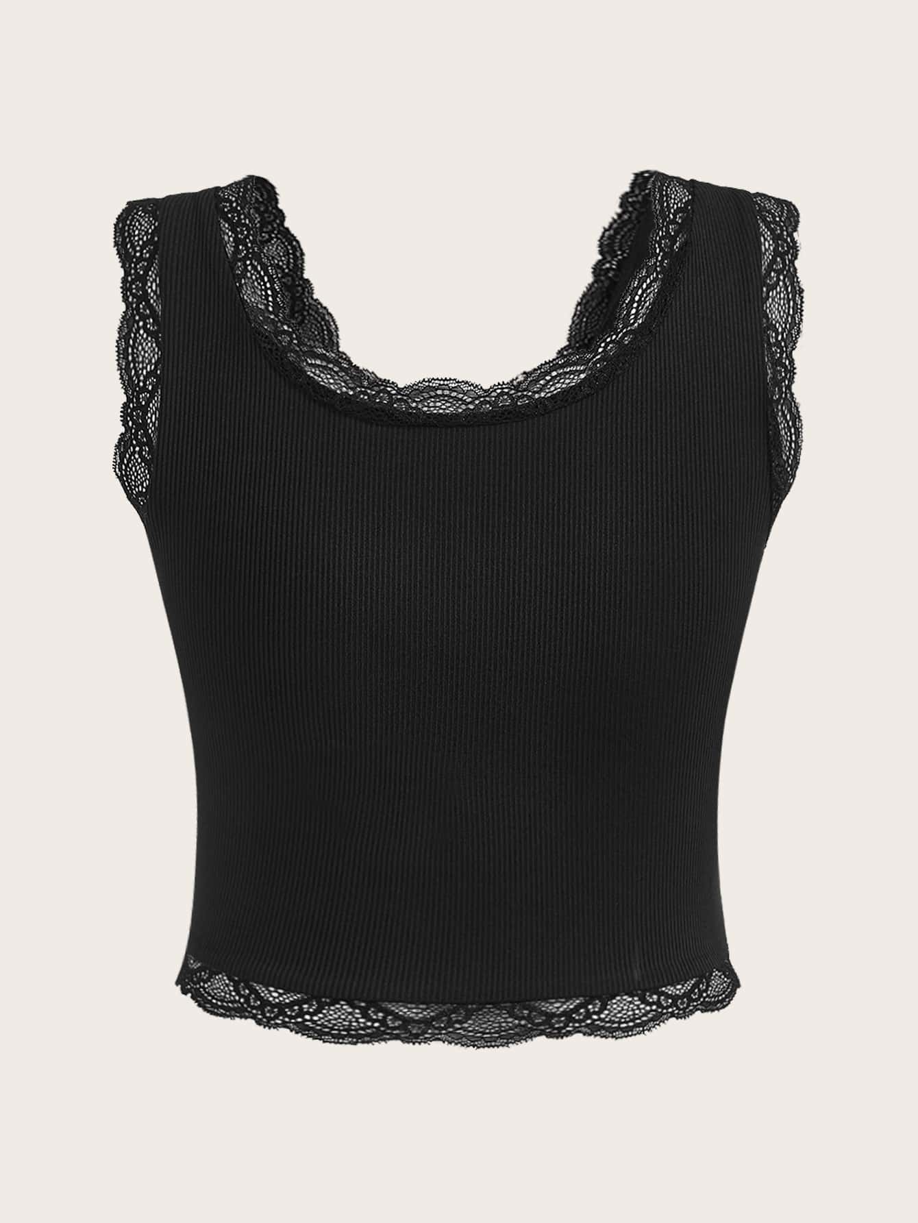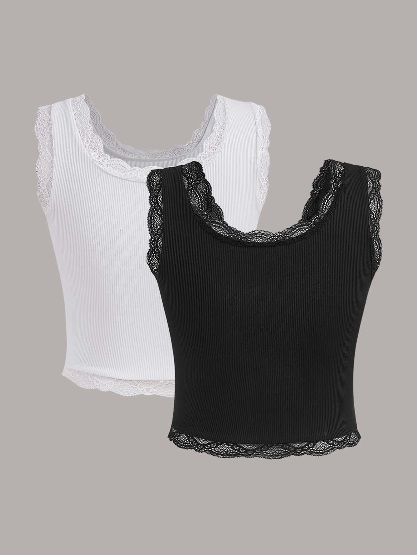 2pcs Solid Contrast Lace Tank Top
