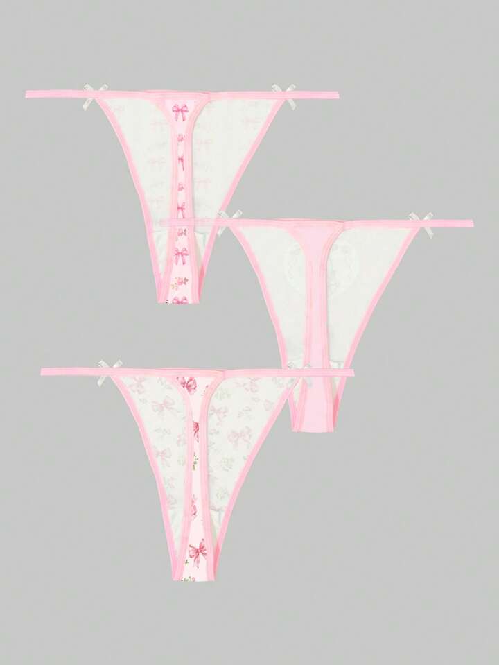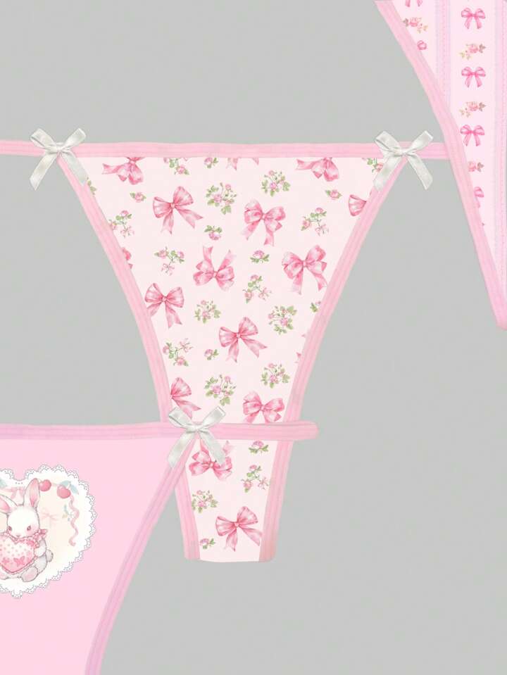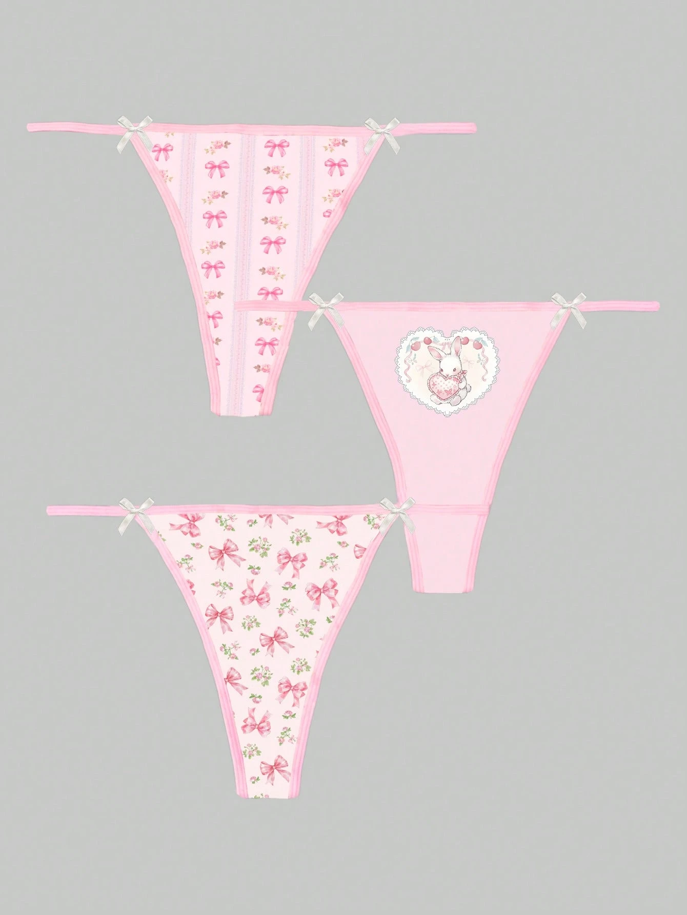 3 Piece Set Kawaii Bow, Floral & Rabbit Print Plus Size Women Thong Underwear