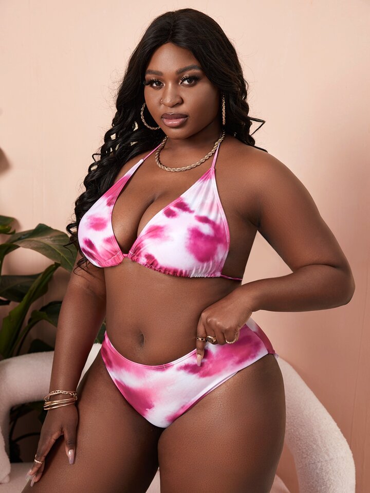 3packs Plus Size Tie Dye Halter Triangle Bikini Set & Kimono Summer Beach
