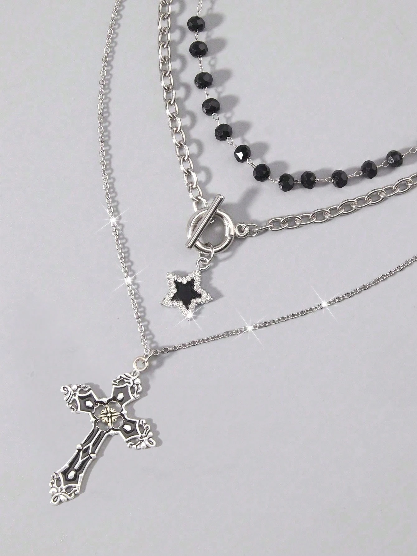 3pcs Gothic Style Black Beaded, Red Heart & Red Cross Necklace Set, Halloween Gift