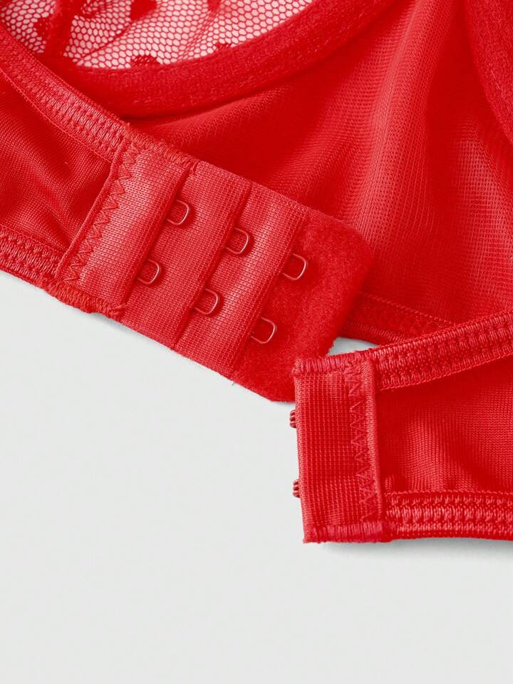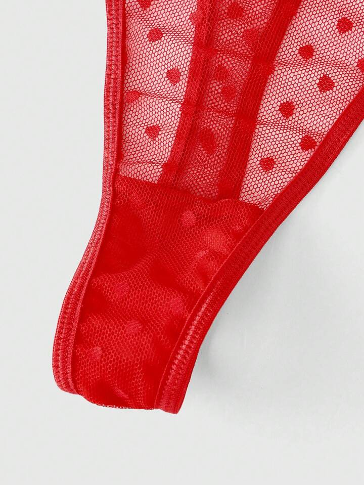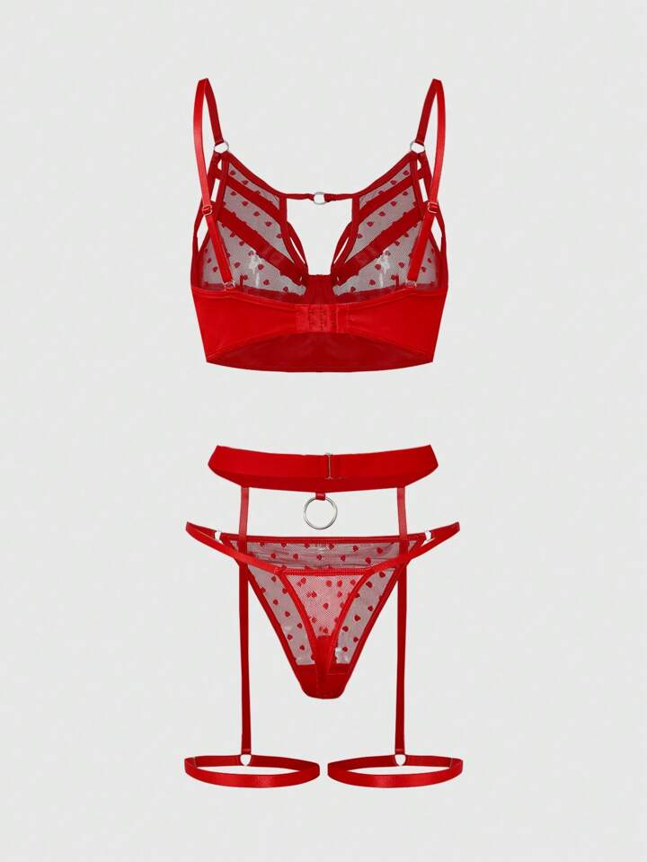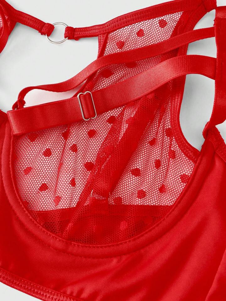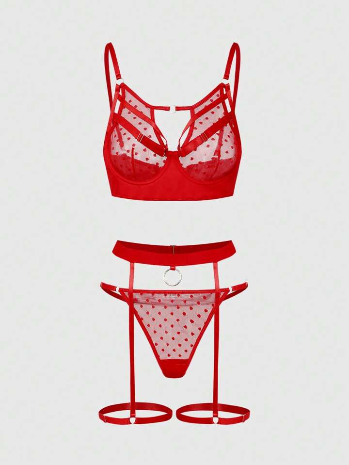 3pcs Gothic Style Polka Dot Mesh Underwire Bra, Chain Halter, And Garter Belt, Sexy Lingerie Set