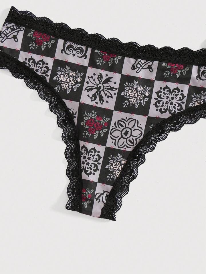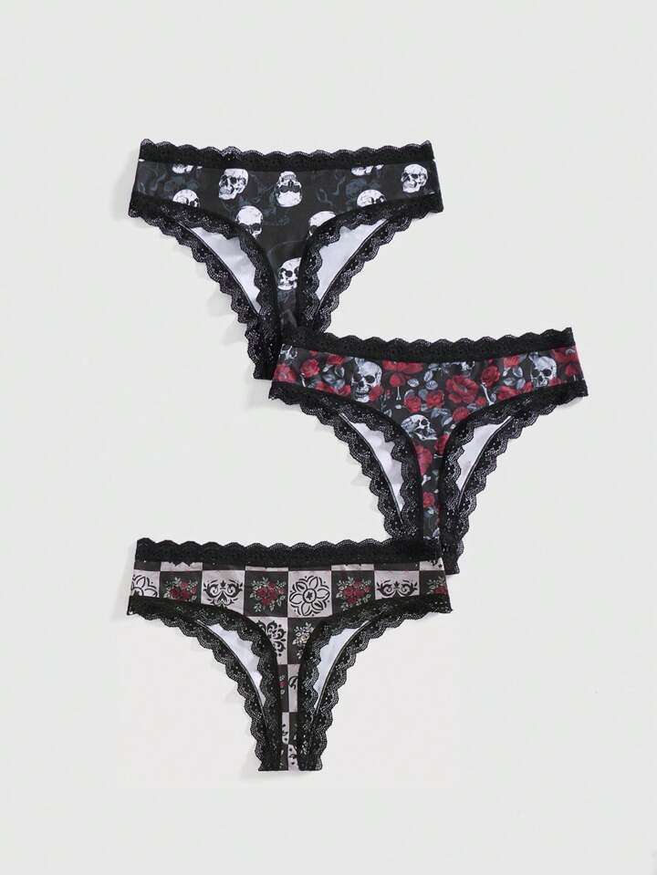 3pcs/Set Gothic Rose Skull Bat Allover Print Lace Patchwork Thong Panties