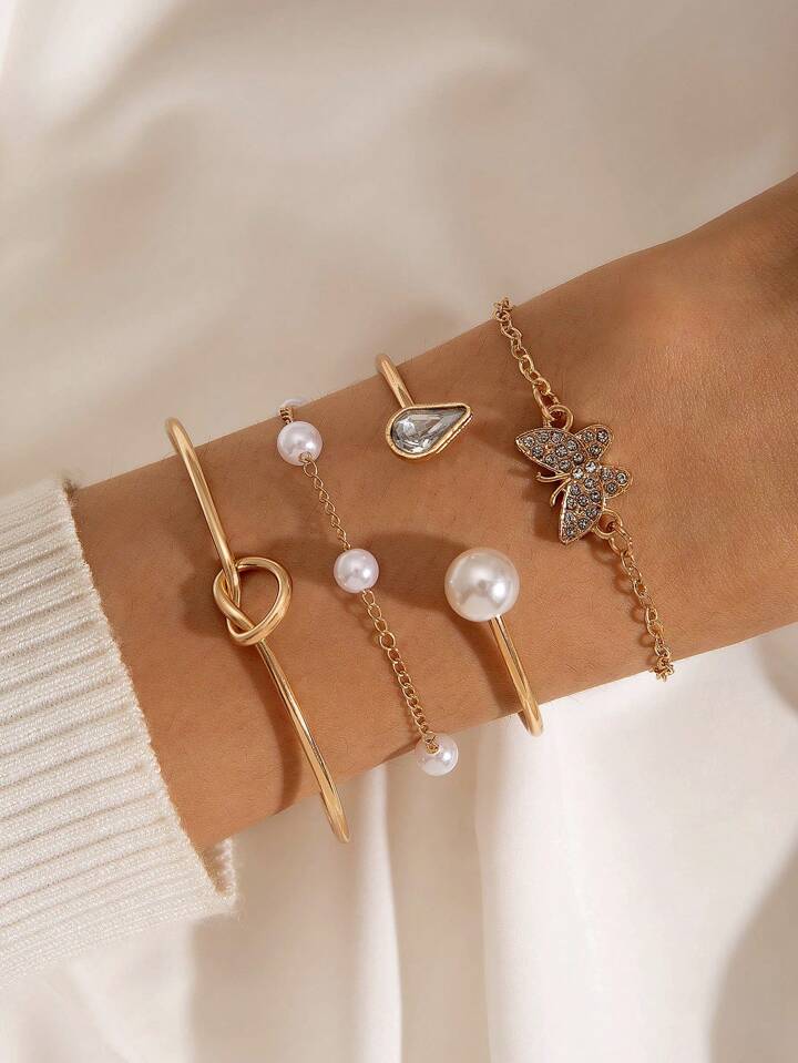 4pcs/set Simple Ins Style Alloy Love Knot Ball Pearl Drop Rhinestone Bangle, Butterfly Pearl Beaded Bracelet For Women, Dating Gift (handmade Bracelet Cut By Size, Number Of Rice Beads Is Uncertain)