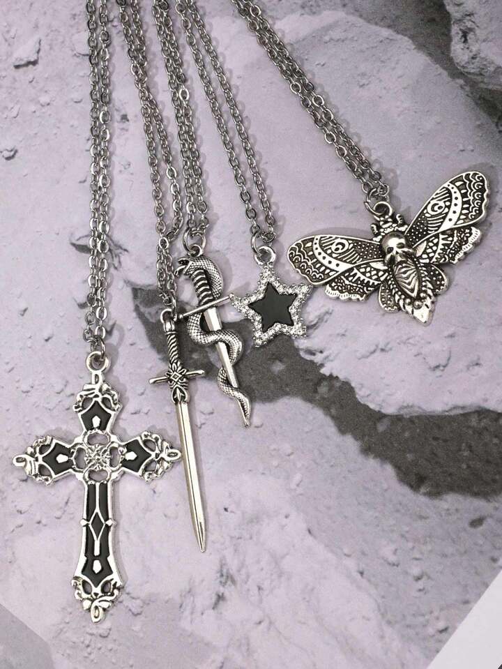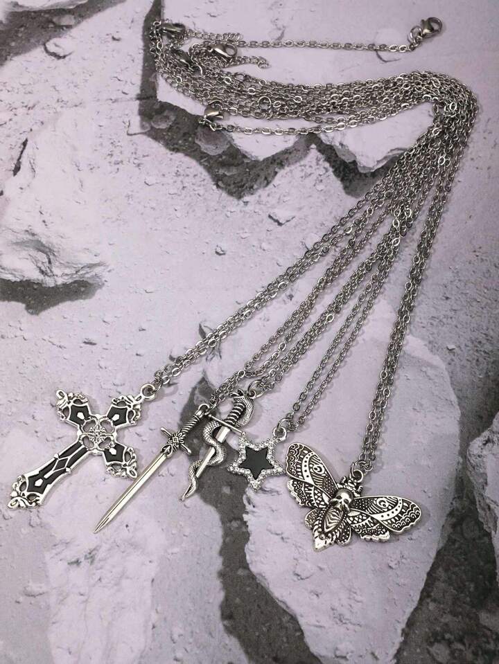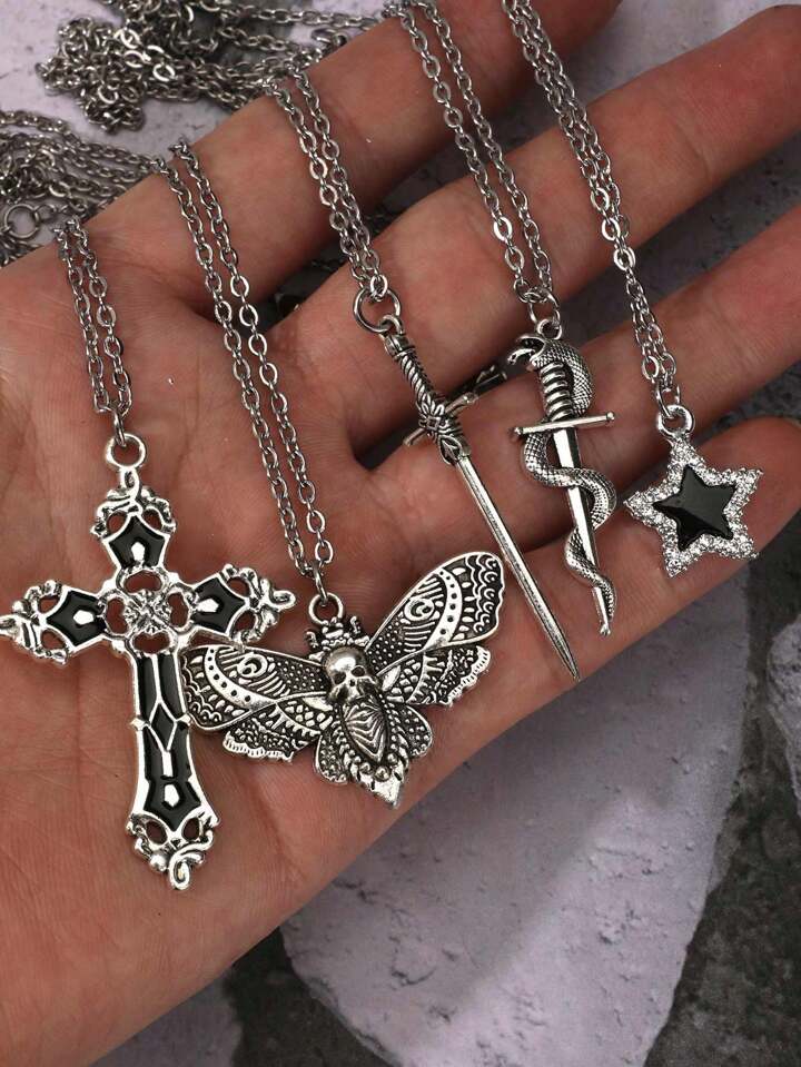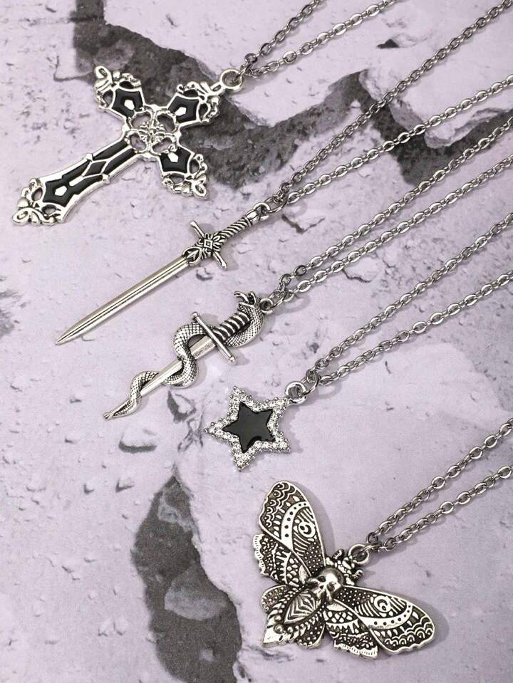 5pcs Vintage Gothic Style Cross Diamond Inlaid Star Snake Sword Pendant Necklace Set For Women