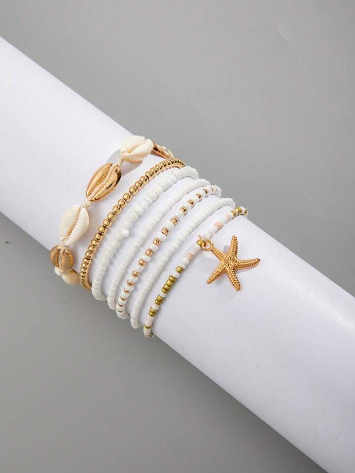 7pcs Bohemian Style Casual Beach Holiday Look Artificial Resin Starfish & Shell Beaded Bracelet Set Women Party Jewelry Gift