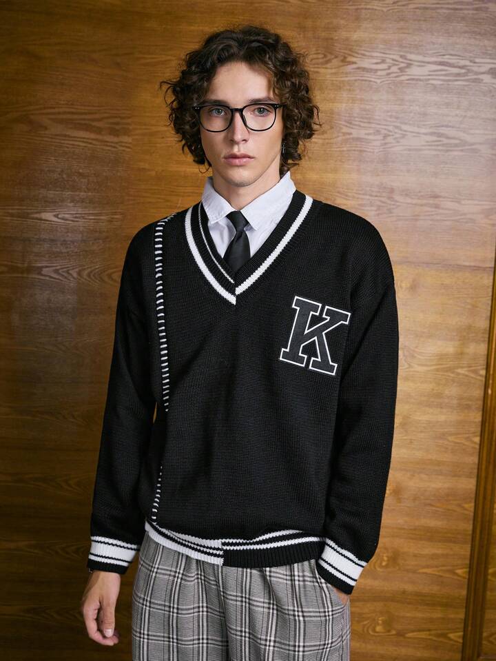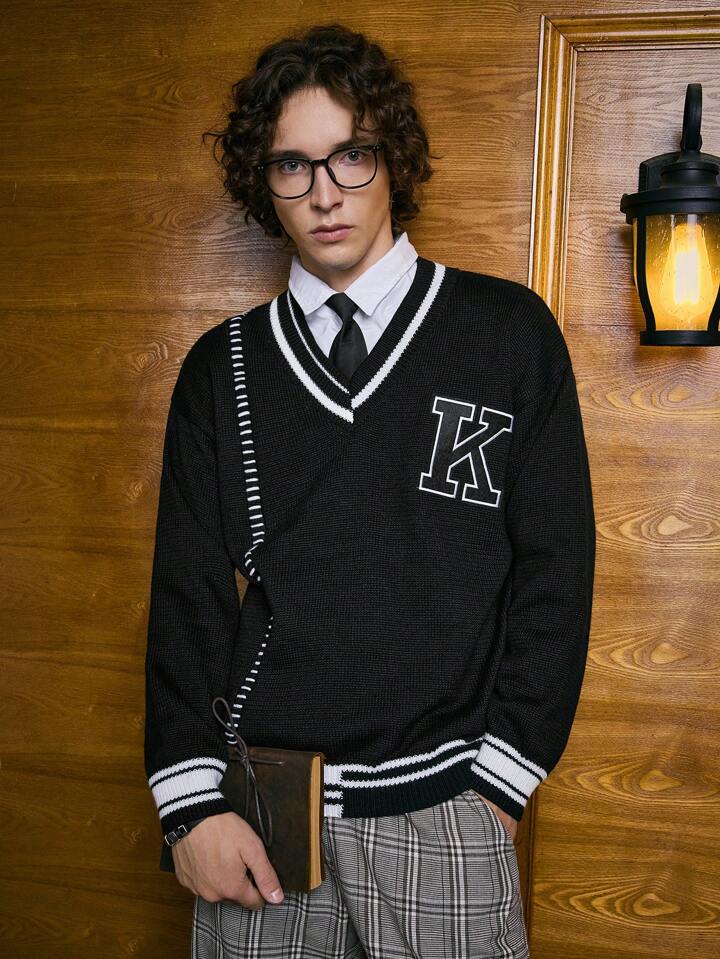 Academia Guys Letter Pattern Striped Trim Drop Shoulder Cricket Sweater