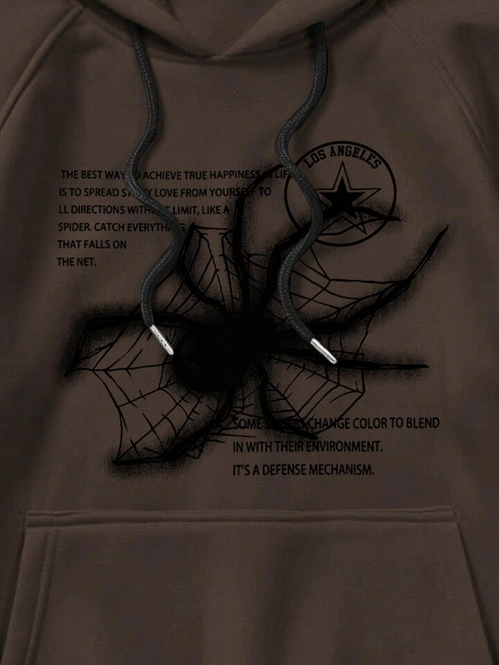 Academia Men's Spider Web & Letter Print Kangaroo Pocket Drawstring Hooded Sweatshirt