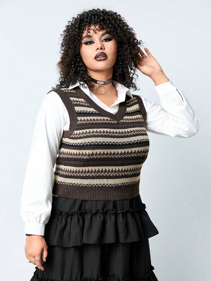 Academia Plus Size Vintage Jacquard Striped Sweater Vest