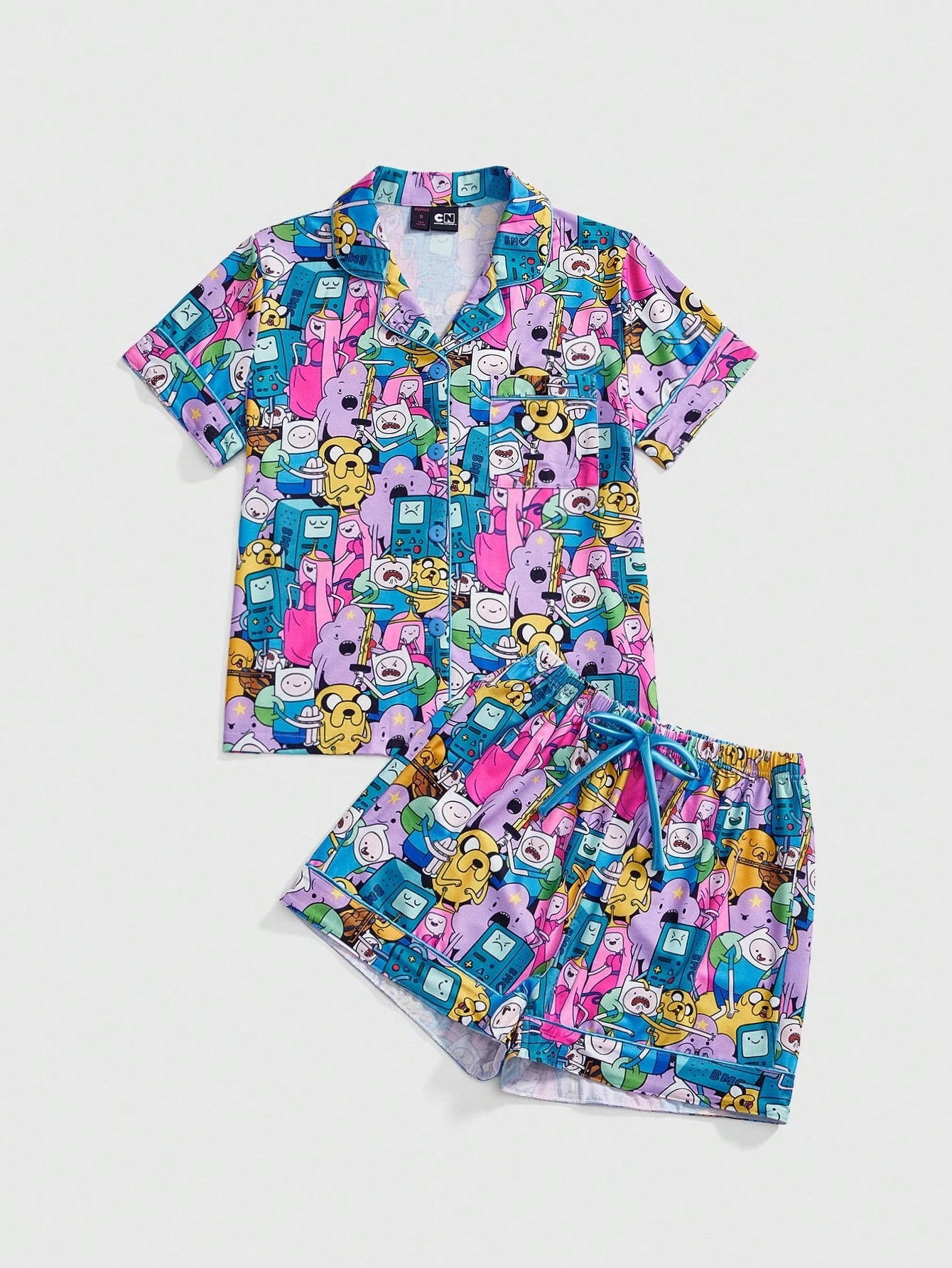 Adventure Time X ROMWE Cute Cartoon Pattern Top & Shorts Pajama Set, Cotton