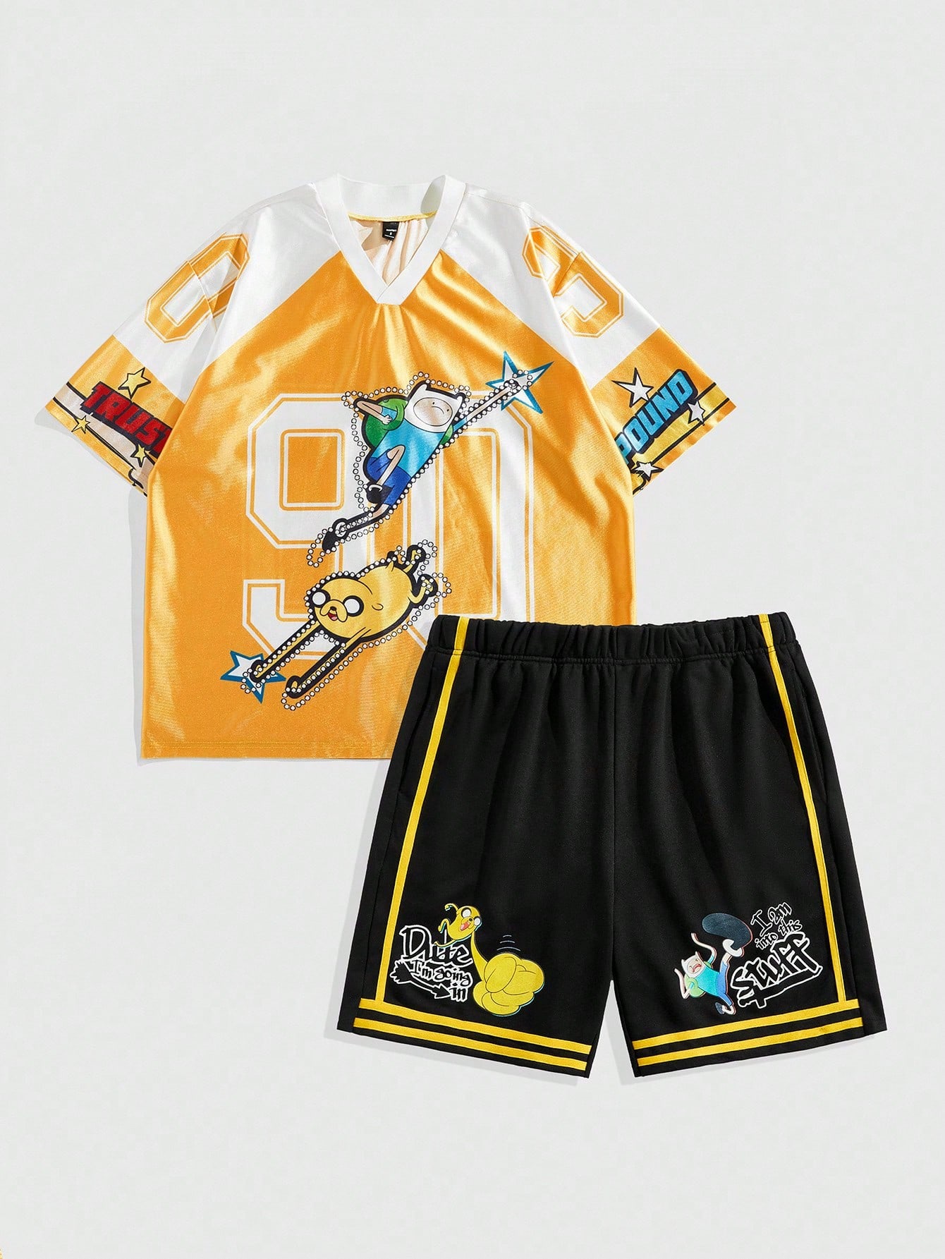 Adventure Time X ROMWE Men's Casual Contrast Color Letter & Cartoon Pattern Round Neck Short Sleeves Set