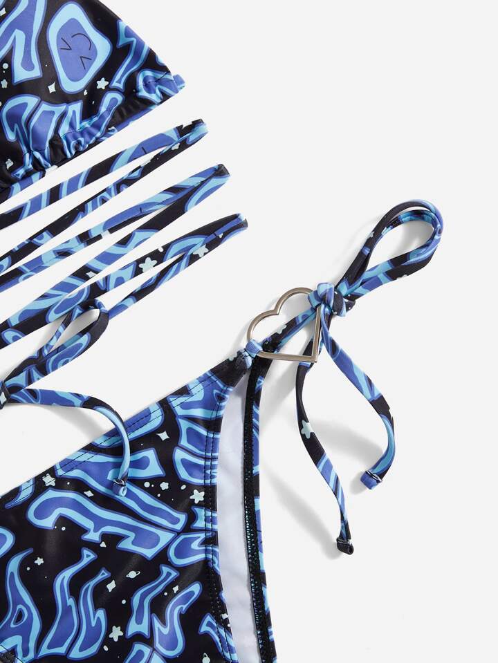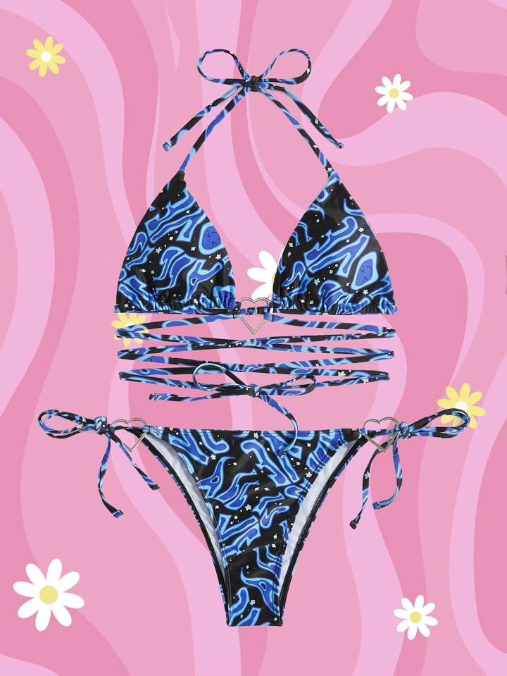 All Over Print Heart-Ring Linked Criss Cross Halter Tie Side Bikini