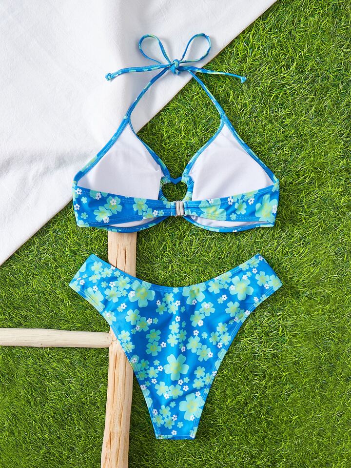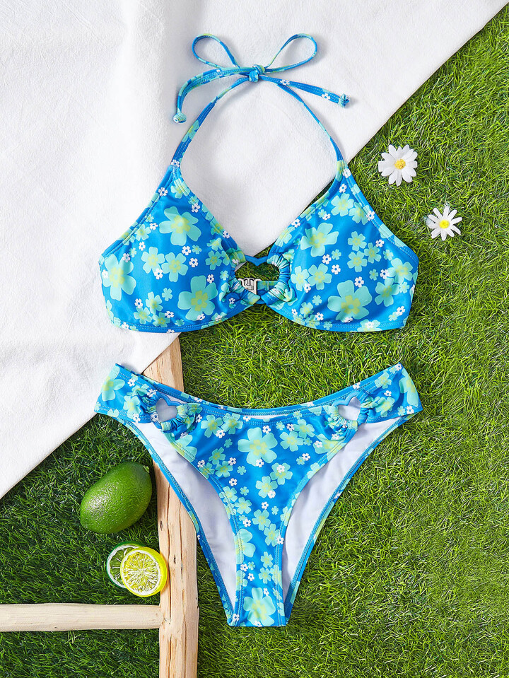 Allover Floral Print Ring Linked Summer Beach Bikini Set