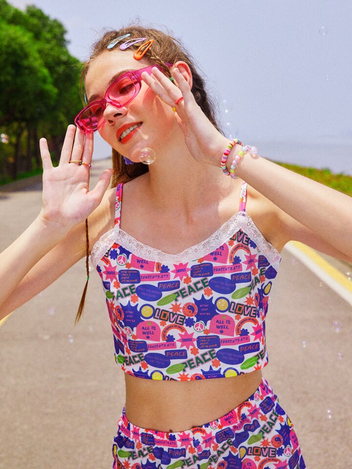 Allover Letter Print Lace Trim PJ Set