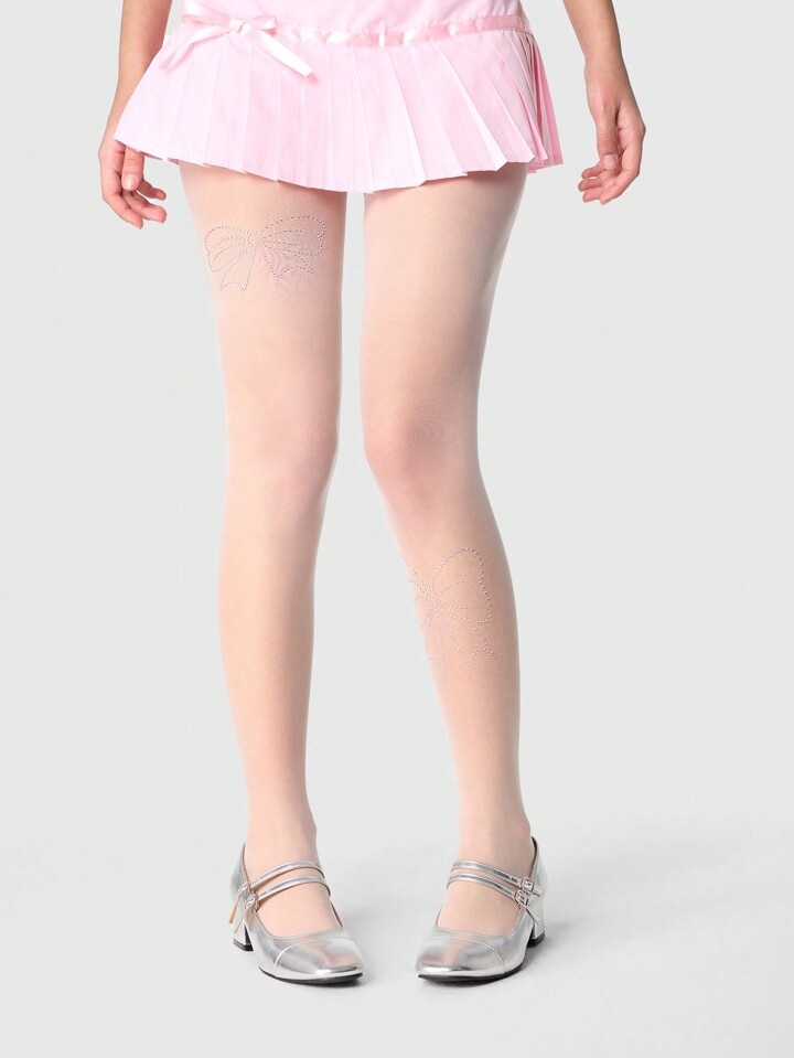 Anime 1 Pair White Bow Rhinestone Decorated Pantyhose, Sexy Sheer Tights With Elasticity For Slim Legs, Thin Stockings
